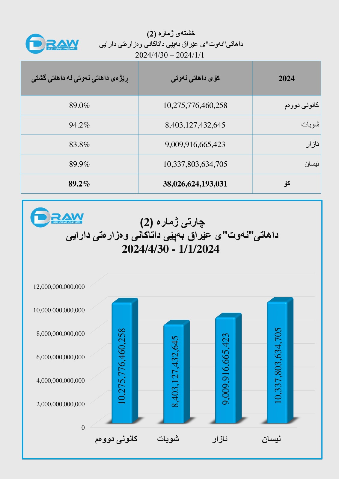 پاڵپشت بە ڕاپۆرتەکانی وەزارەتی دارایی عێراق، کە دواترینیانی بۆ نیسانی ساڵی (2024) لە (9ی حوزەیرانی 2024) بڵاو کردووەتەوە، کۆی داهاتی گشتی عێراق بە هەردوو داهاتی (نەوتی و نانەوتییەوە)، بریتی بووە لە (42 ترلیۆن و 725 ملیار و 409 ملیۆن و 202 هەزار و 511) دینار، بەجۆرێک بڕی (38 ترلیۆن و 26 ملیار و 624 ملیۆن و 193 هەزار و 31) دیناری بەڕێژەی (89.2%)ی لە داهاتی نەوتەوە سەرچاوەی گرتووە، بڕی (4 ترلیۆن و 698 ملیار و 785 ملیۆن و 9 هەزار و 480) دیناری بەڕێژەی (10.8%)ی داهاتی نانەوتی پێکیهێناوە. سەبارەت بە وردەکاری هەر چوار مانگەکانی کانونی دووەم، شوبات، ئازار و نیسانی (2024) بڕوانە (خشتەو چارتی ژمارە (2)) هەروەها گرافیکی هاوپێچ.