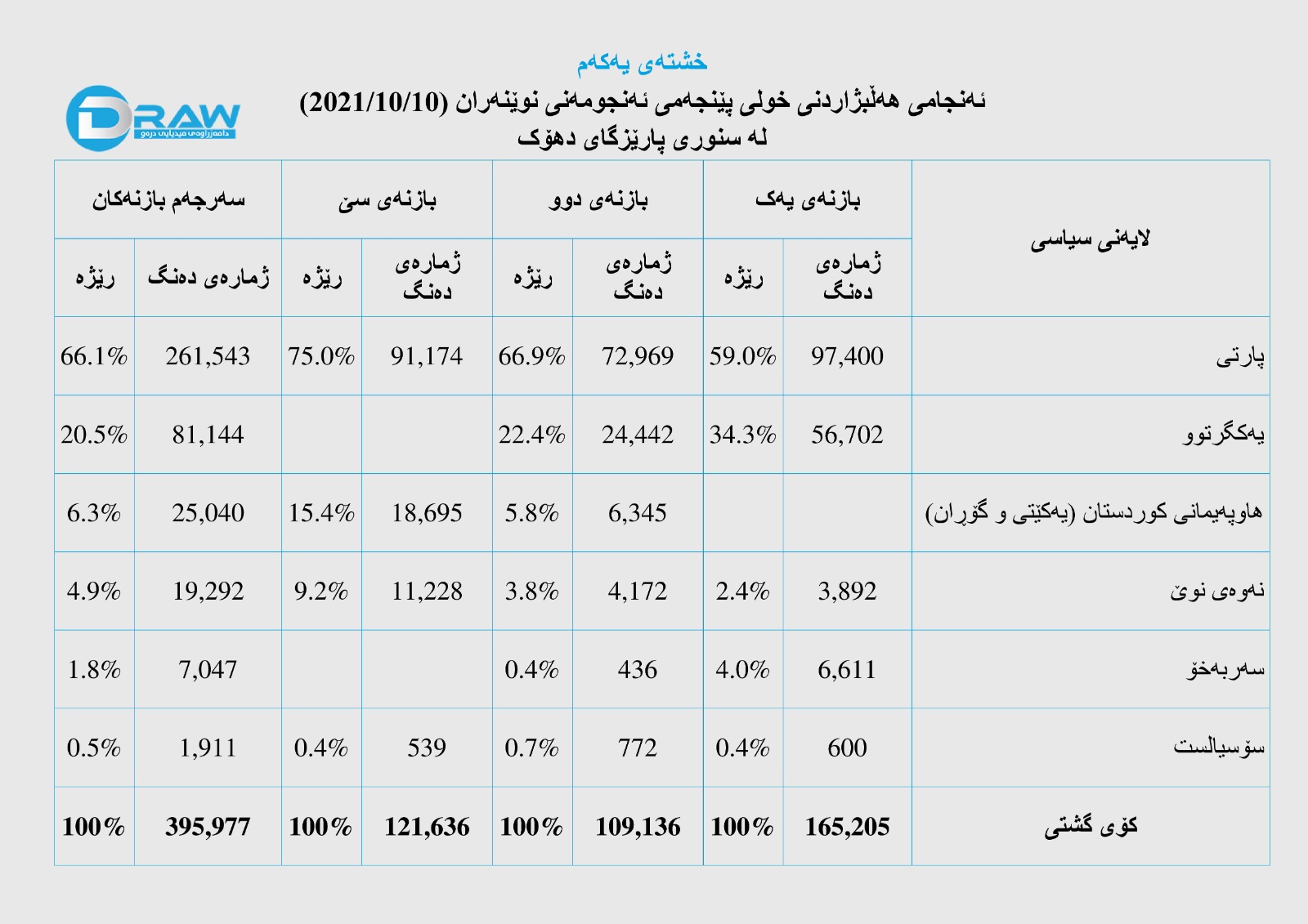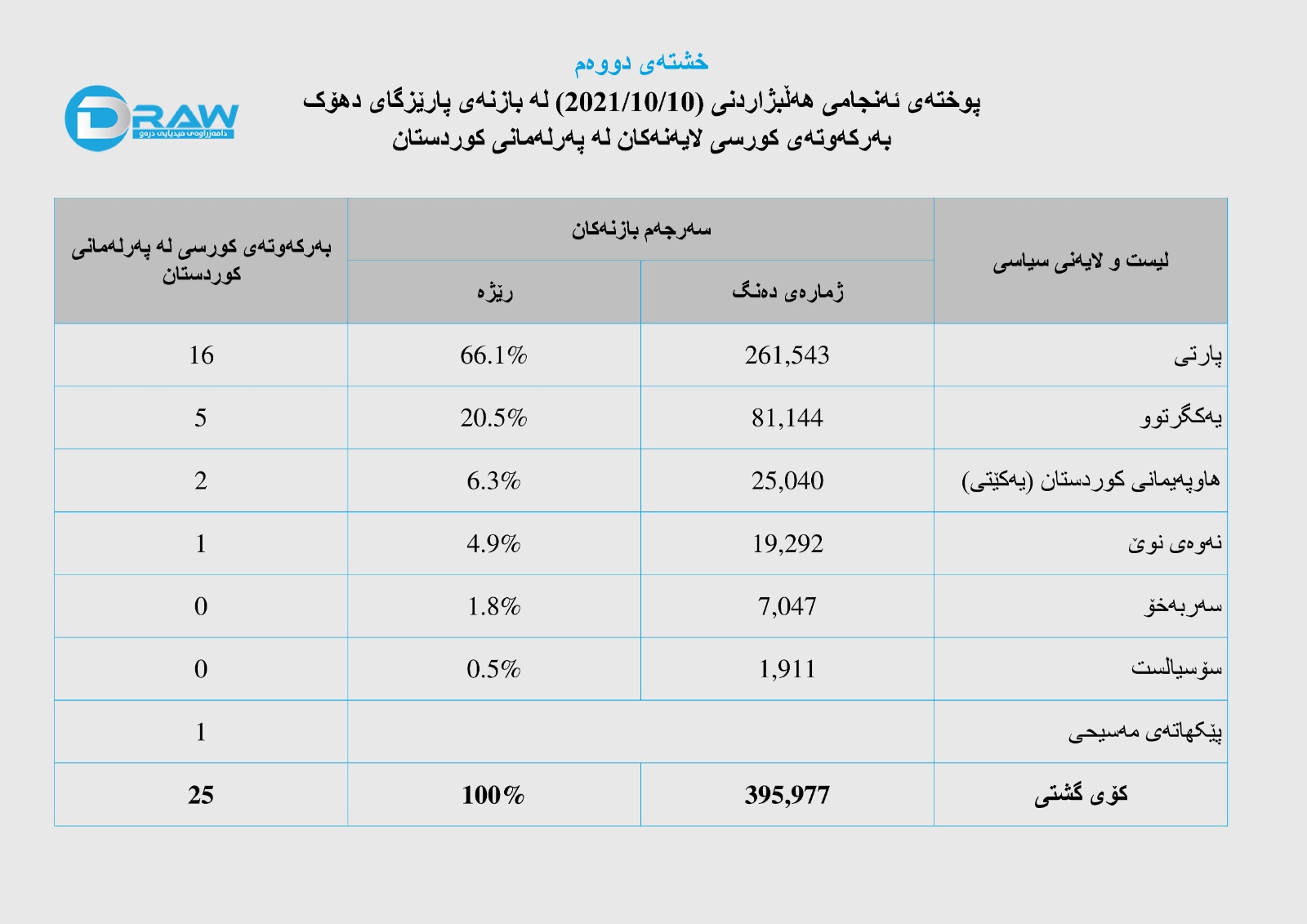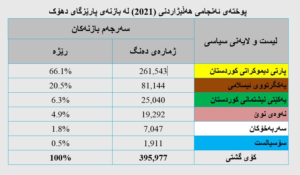 - پارتی دیموکراتی کوردستان لە پلەی یەکەمدا بووەو (261 هەزار و 543) دەنگی بەدەستهێناوە بە رێژەی (66%).