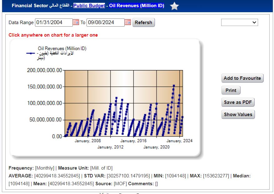 بەپێی داتاکانی بانکی ناوەندی عێراق (CBI) لە دەیەی ڕابردوودا، عێراق داهاتێکی قەبارە گەورەی هەبووە، بەڵام بە وردبوونەوە لە ئامارەکان بەردەوام بە نزیکەیی (90%) ئەو داهاتەی ساڵانە عێراق دەستی دەکەوێت، لە ڕێگەی هەناردەکردن و فرۆشتنی نەوتی خاوەوە بووە، هەر ئەم هۆکارەشە چارەنوسی دۆخی دارایی و ئابوری عێراقی گرێداوە بە بەرزی یاخود نزمی نرخی نەوتەوە لە بازاڕەکانی جیهاندا، بۆیە ساڵانە هەڵبەزو دابەزی زۆر لە داهاتی گشتی عێراقدا تۆمار دەکرێت و جۆرێک لە سەقامگری بەخۆوە نابینێت.