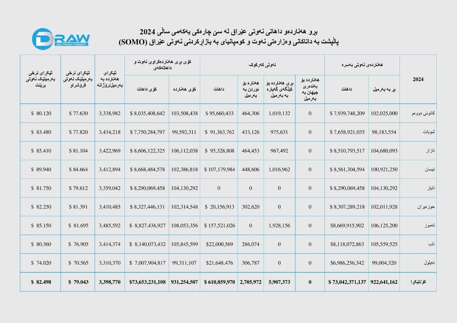 پاڵپشت بە داتاکانی وەزارەتی نەوتی عێراق و بەڵگەنامەکانی کۆمپانیای بە بازاڕکردنی نەوتی عێراق (سۆمۆ)، لە سێ چارەکی یەکەمی 2024؛