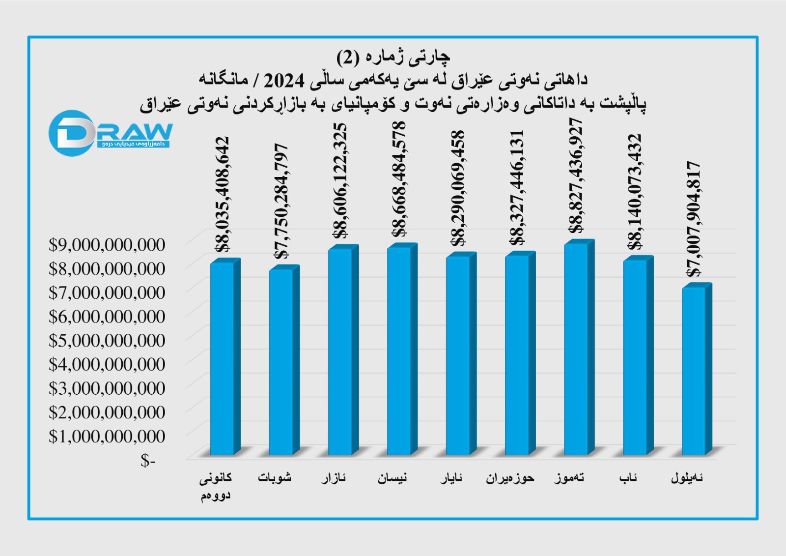 تێبینی؛ لە چارەکی سێیەمی ئەمساڵ (تەموز، ئاب و ئەیلول)، تەنها زانیاری لەبارەی بڕو قەبارەی هەناردەی نەوتی عێراق بەردەستە، بۆیە تایبەت بە نرخی نەوتی فرۆشراوی عێراق و کۆی داهات پشت بە (تێکڕای نرخی نەوتی برێنت) بەستراوە، بەجۆرێک لە شەش مانگی یەکەمی ساڵەکەدا عێراق هەر بەرمیلێک نەوتی بە (3 دۆلار و 45 سەنت) هەرزانتر لە نەوتی برێنت فرۆشتووە، بۆیە لەو سێ مانگەدا نرخی نەوت و کۆی داهاتی عێراق لەسەر بنەمای ئەو پێوەرە وەرگیراوە.