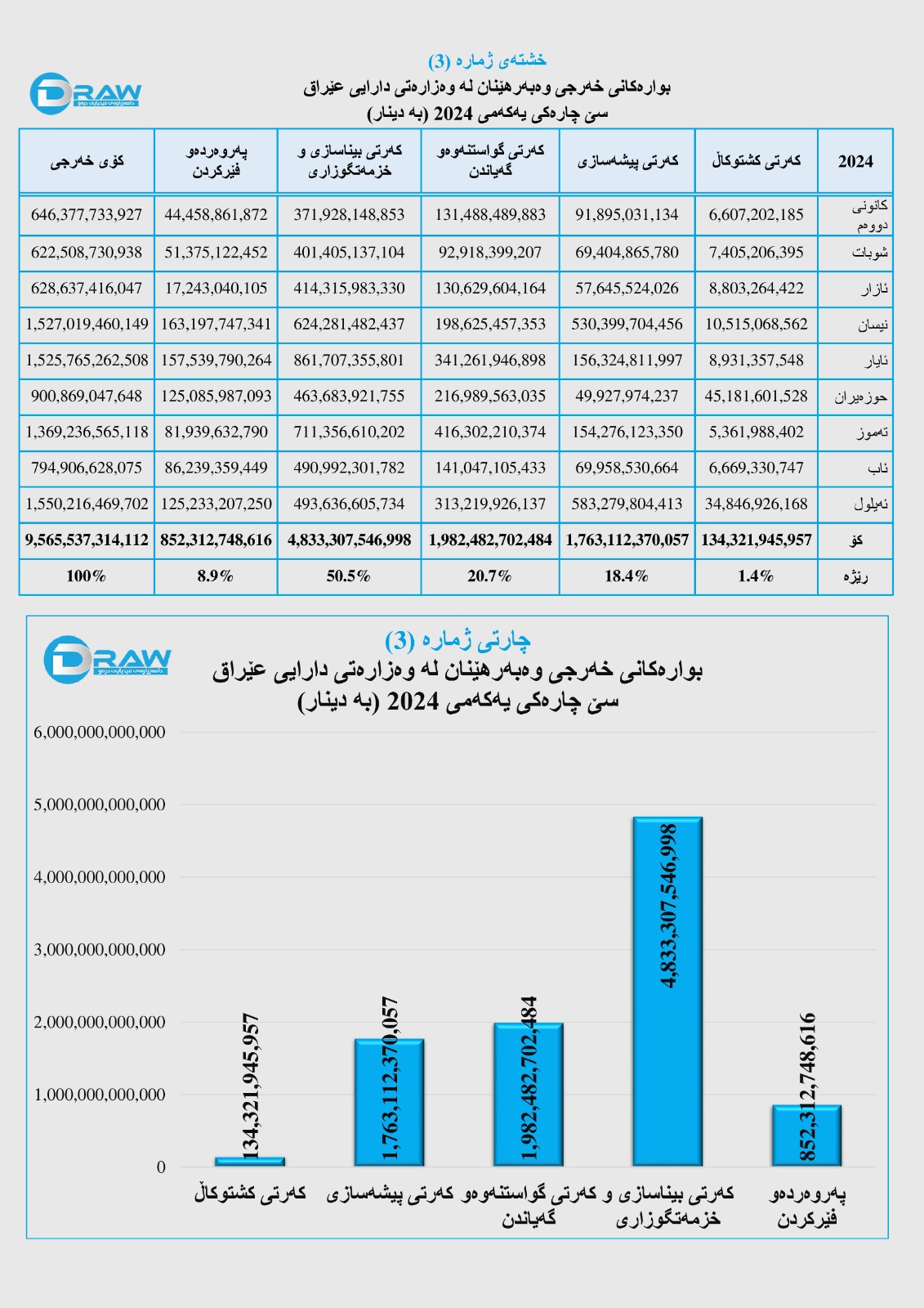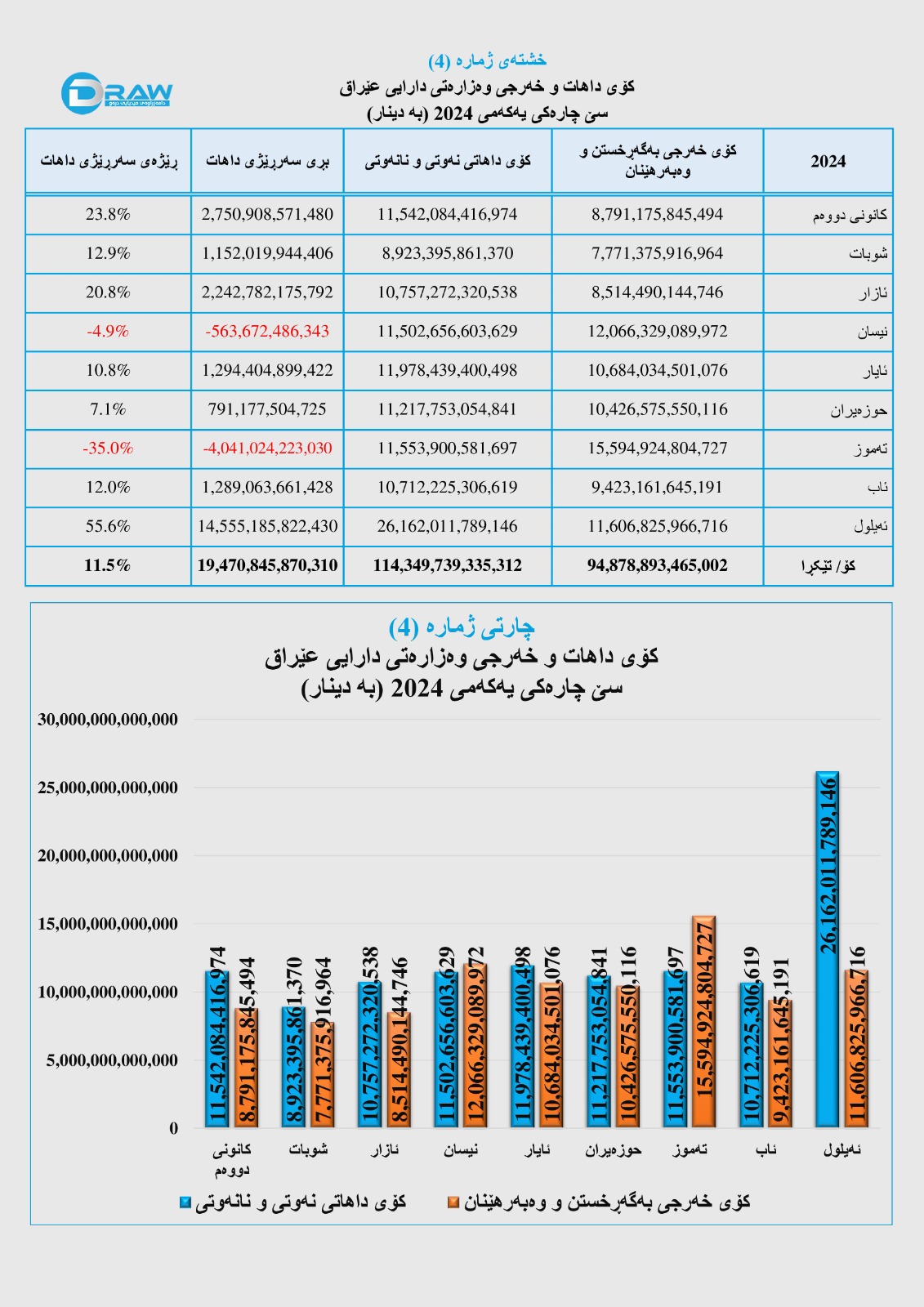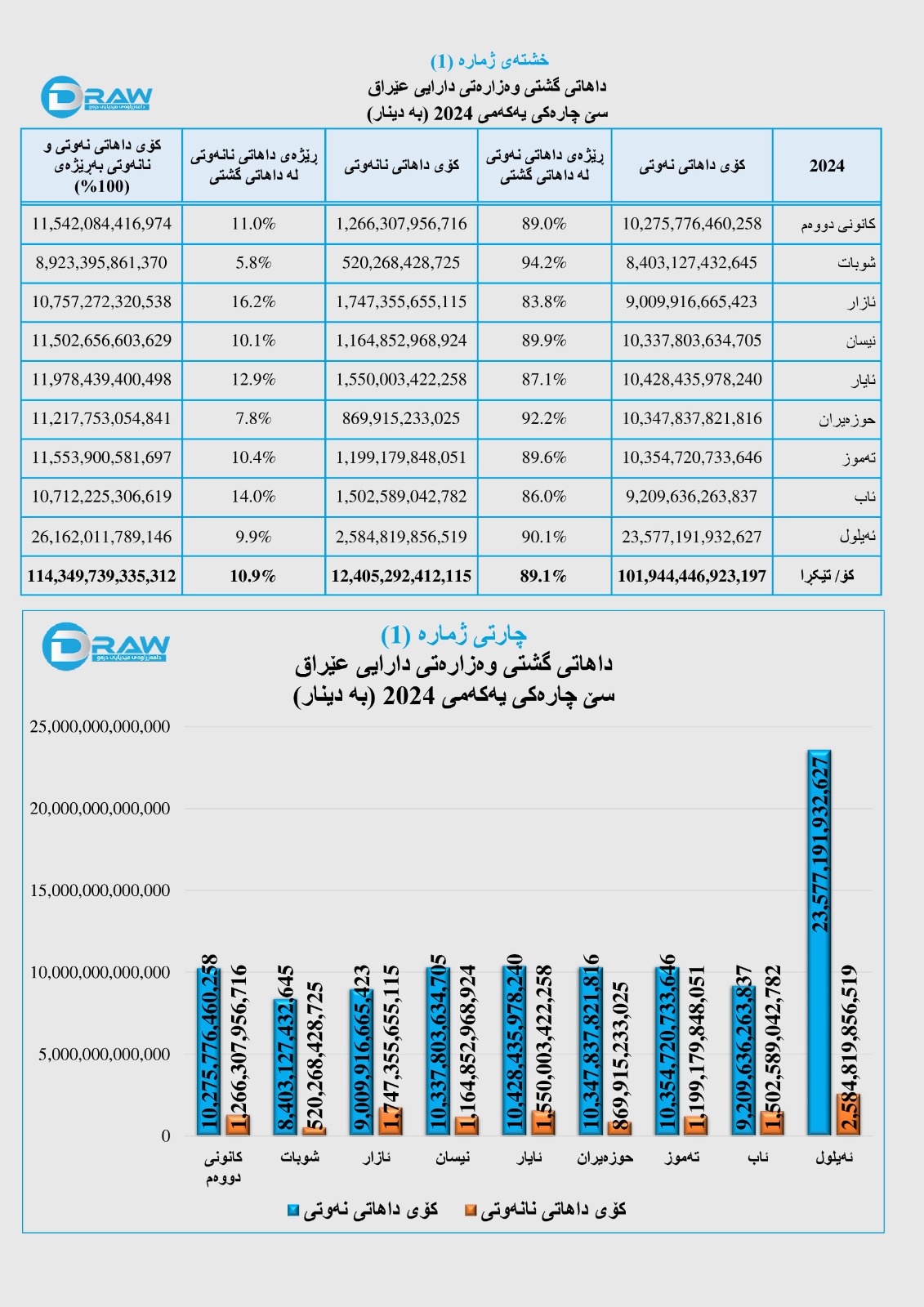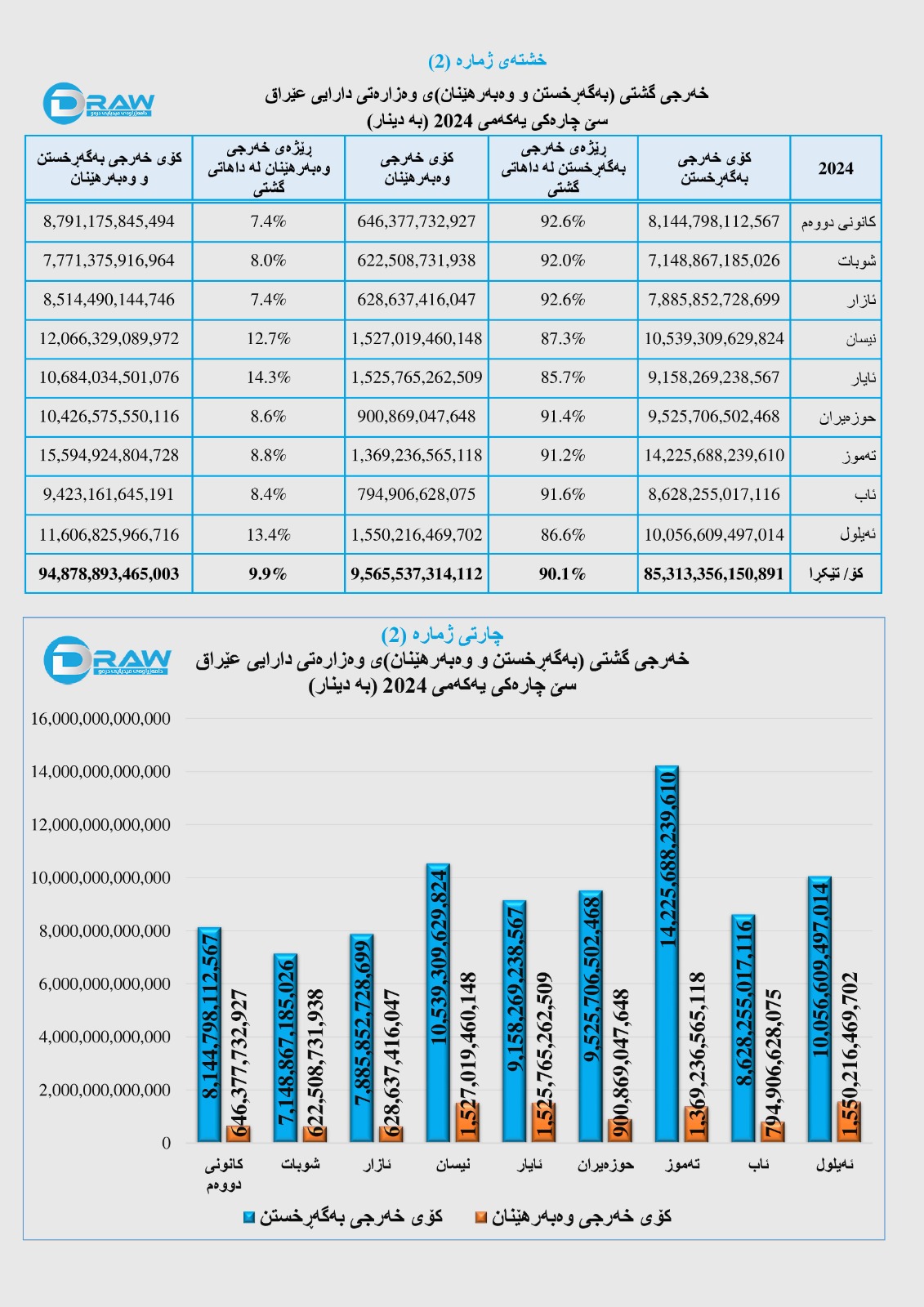 رۆژی (26ی تشرینی دووەمی 2024) وەزارەتی دارایی عێراق داهات و خەرجی خۆی بۆ سێ چارەکی یەکەمی ئەمساڵ بڵاوکردەوە، بەپێی ڕاپۆرتەکانی وەزارەتەکە؛