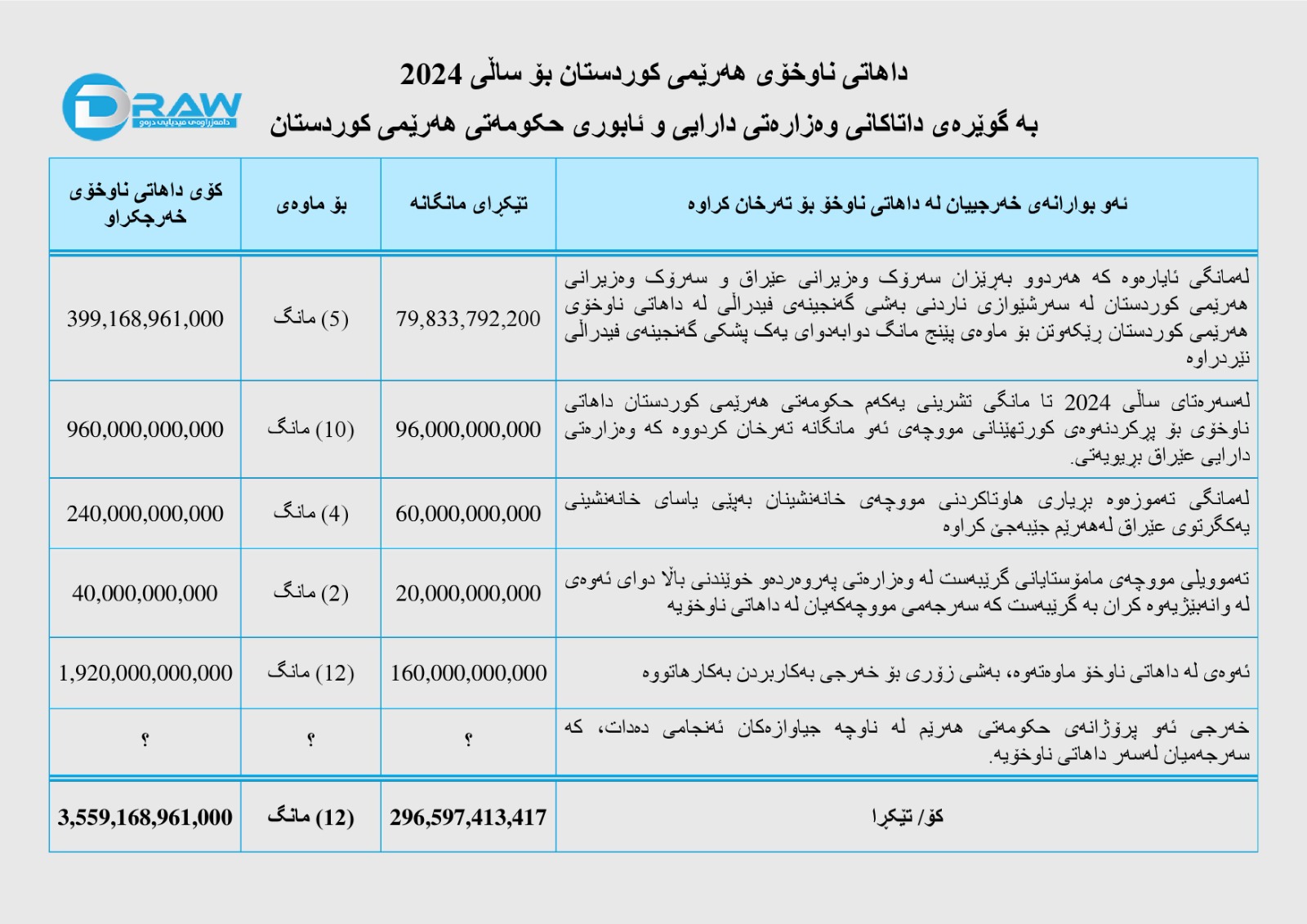 بەڵام کۆی داهاتی ناوخۆی حکومەتی هەرێمی کوردستان کە لە ساڵی (2024) خەرج کراوە "وەک لە سەرەوە ئاماژەی بۆ کراوە"، بە نزیکەیی بریتی بووە لە (3 ترلیۆن و 559 ملیار و 168 ملیۆن) دینار، واتە بە تێکڕای مانگانە داهاتی ناوخۆی خەرجکراو بریتی بووە لە (296 ملیار و 597 ملیۆن و 413 هەزار) دینار.
