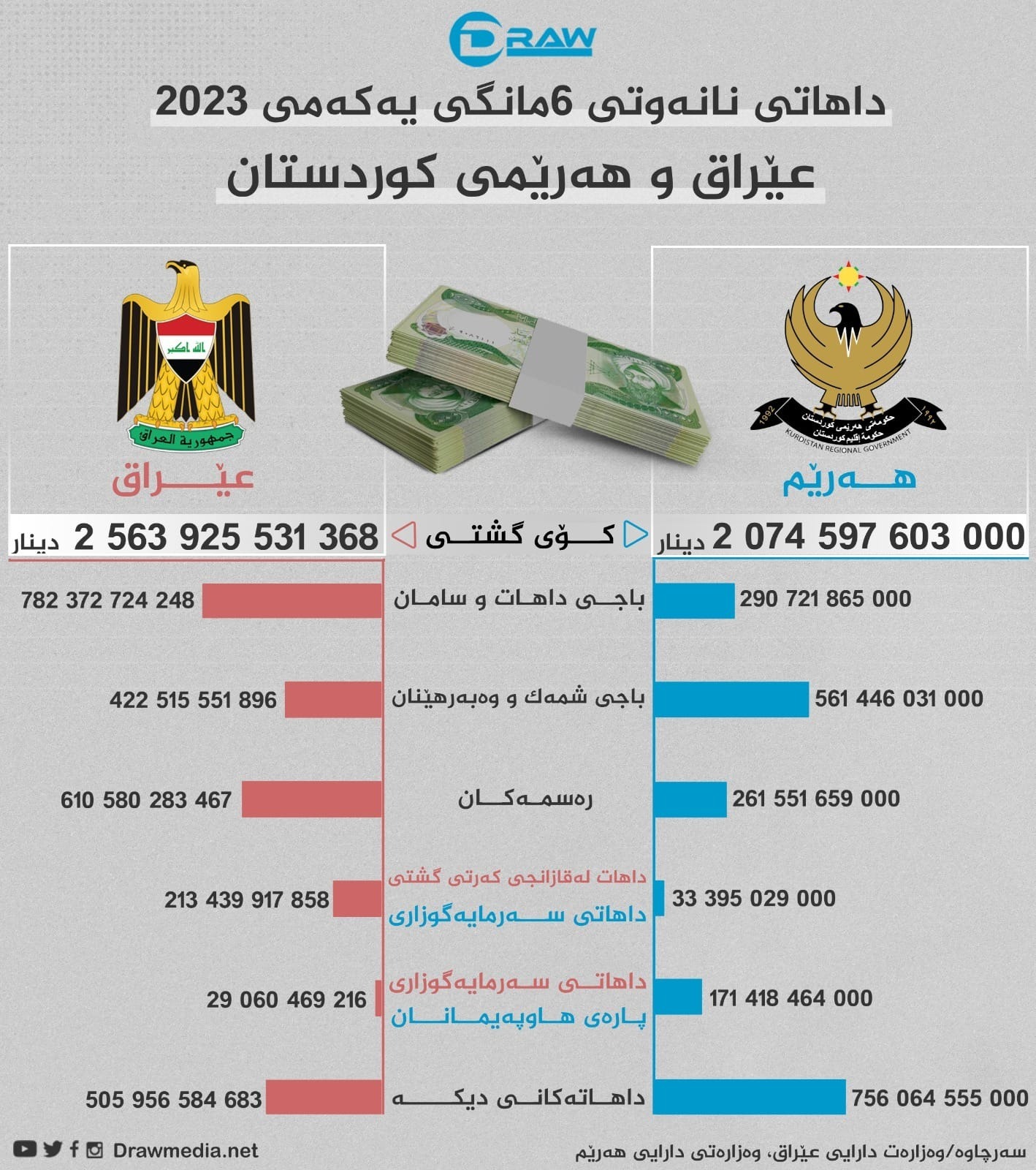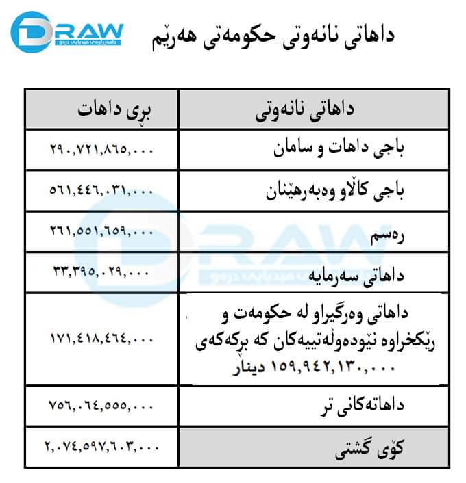 لەگەڵ ئەوەی داهاتی ناوخۆی تەواوی ساڵی (2023) ڕوون نیە، بەڵام بە پێی داتاکانی وەزارەتی دارایی هەرێم بۆ شەش مانگی یەکەمی ساڵی (2023) بەم شێوەیە بووە؛