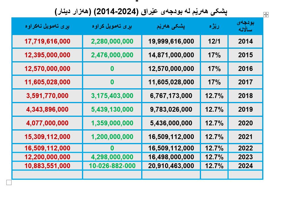 - لە 2014 – 2023 بڕی (19 ترلیۆن و 27 ملیار) دینار لە بەغدادەوە بۆ هەرێمی كوردستان نێردراوە،
