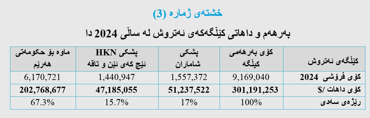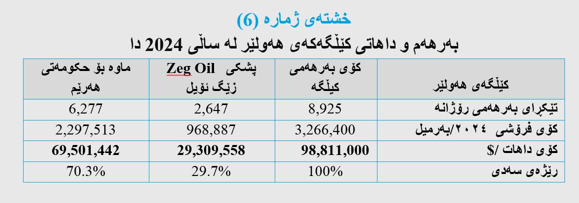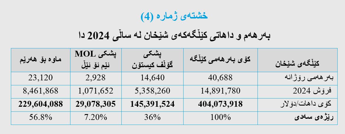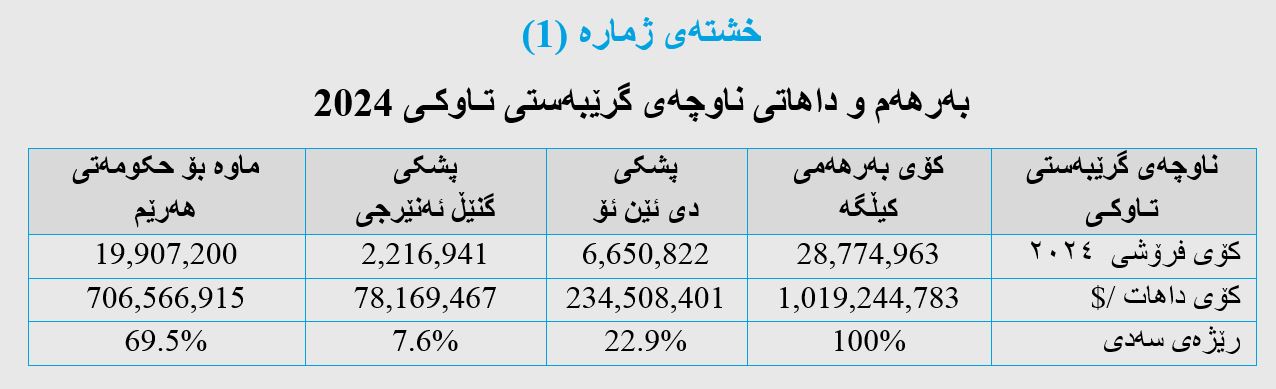 ? بە گوێرەی ڕاپۆرتێکی ڕێکخراوە ڕوونبین بۆ شەفافییەت لە پرۆسەکانی نەوتی هەرێم، لە ساڵی 2024دا، پشکی حکومەتی هەرێم لە نەوت و داهات بەم جۆرەبووە؛