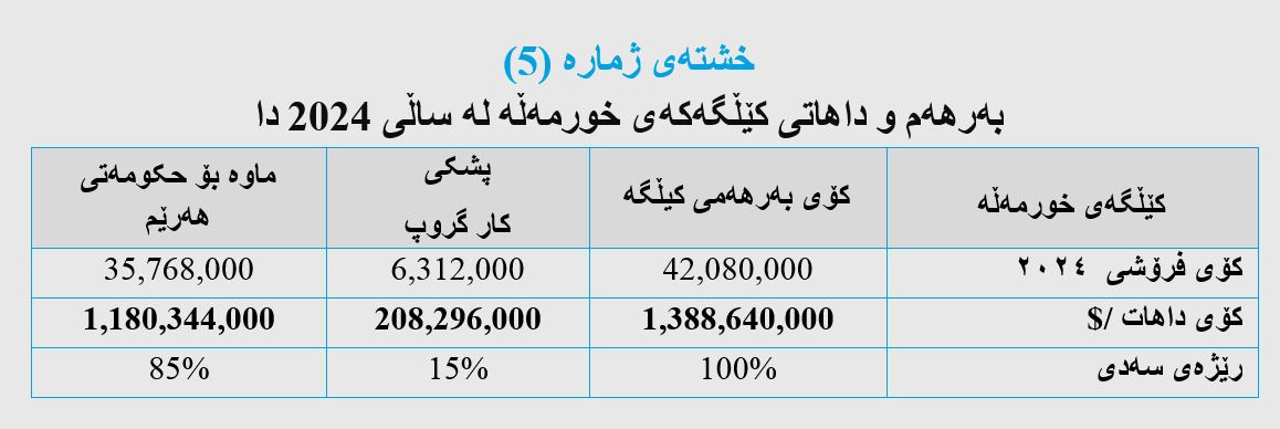 ? لە کێڵگەی نەوتی خورمەڵە پشکی حکومەتی هەرێم بریتی بووە (35 ملیۆن و 768 هەزار) بەرمیل، کە کۆی داهاتی کێڵگەکە بۆ حکومەت بریتی دەبێت لە (ملیارێک و 180 ملیۆن و 344 هەزار) دۆلار. بەڕێژەی (85%).