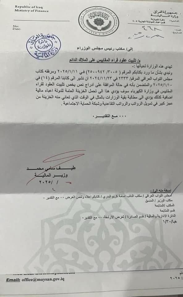 وێنەی نوسراوی وەزارەتی دارایی عێراق بۆ نوسینگەی سەرۆک وەزیران