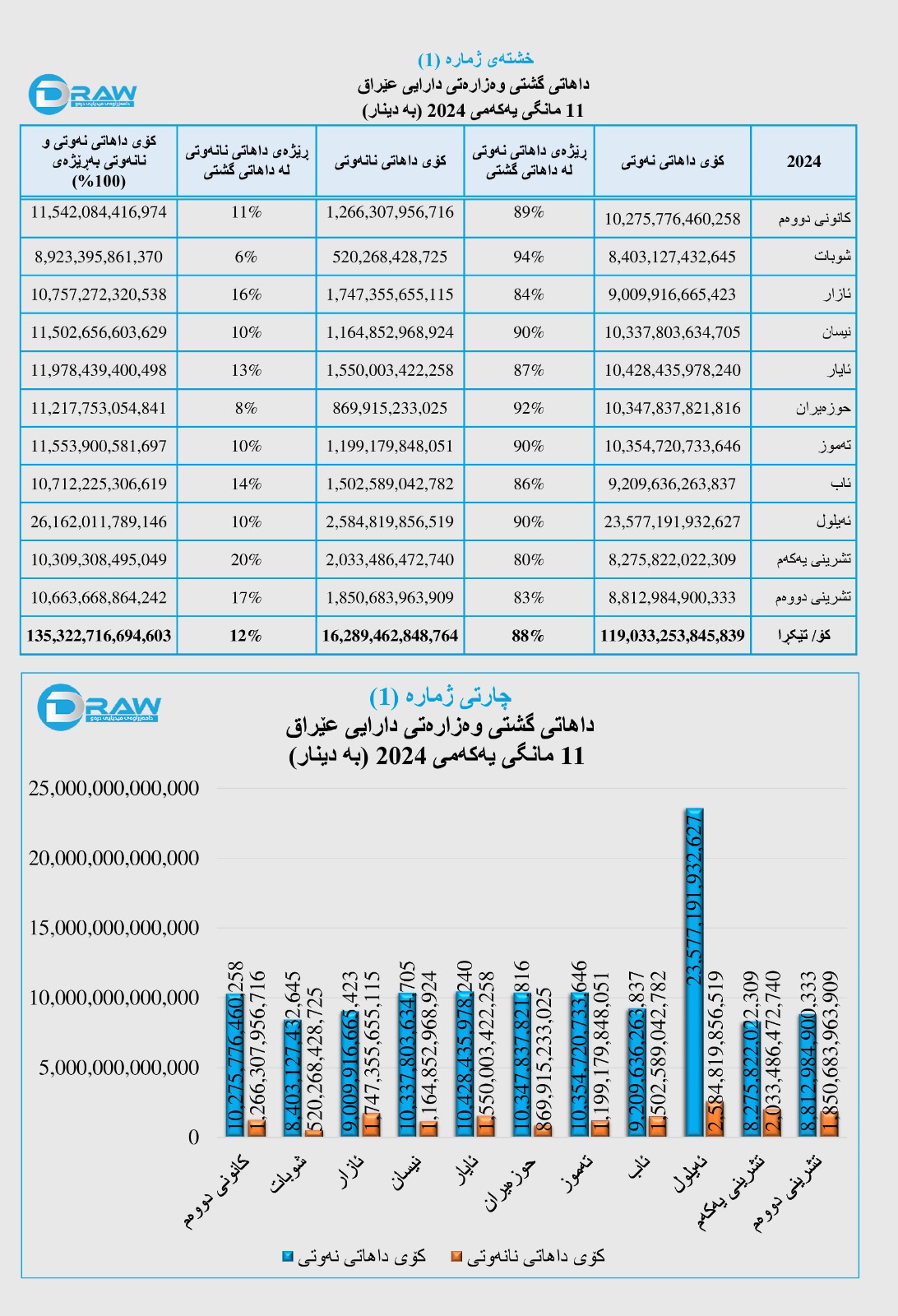 پاڵپشت بە ڕاپۆرتەکانی وەزارەتی دارایی عێراق، کە دواترینیانی بۆ مانگەکانی تشرینی دووەمی ساڵی (2024) لە (9ی شوباتی 2025) بڵاو کردووەتەوە، کۆی داهاتی گشتی عێراق بە هەردوو داهاتی (نەوتی و نانەوتییەوە)، بریتی بووە لە (135 ترلیۆن و 322 ملیار و 716 ملیۆن و 694 هەزار) دینار، بەجۆرێک بڕی (119 ترلیۆن و 33 ملیار و 253 ملیۆن و 845 هەزار) دیناری بەڕێژەی (88%)ی لە داهاتی نەوتەوە سەرچاوەی گرتووە، بڕی (16 ترلیۆن و 289 ملیار و 462 ملیۆن و 848 هەزار) دیناری بەڕێژەی (12%)ی داهاتی نانەوتی پێکیهێناوە. سەبارەت بە وردەکاری هەر 11 مانگی یەکەمی ساڵی (2024) بڕوانە (خشتەو چارتی ژمارە (1)).