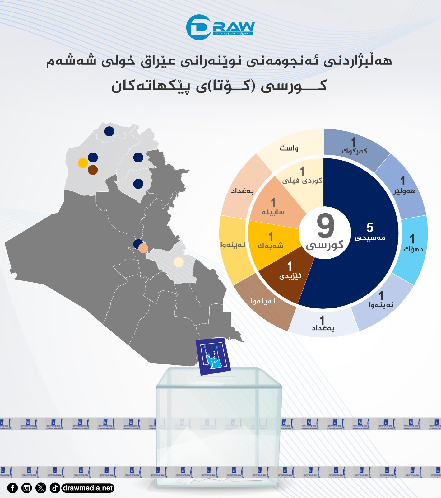 ئامادەكارییەكان بۆ هەڵبژاردنی خولی شەشەمی ئەنجومەنی نوێنەرانی عێراق كە بڕیارە رۆژی 11ی تشرینی دووەمی ئەمساڵ بەڕێوەبچێت، بەردەوامە. كۆمسیۆنی باڵای سەربەخۆی هەڵبژاردنەكان (سیستەمی دابەشكردنی كورسییەكان و جێگۆڕكێی ئەندامانی ئەنجومەنی نوێنەران)ی بڵاوكردەوە، كە رۆژی 12ی ئایاری ئەمساڵ (واتا دوێنێ) دەرچووە.