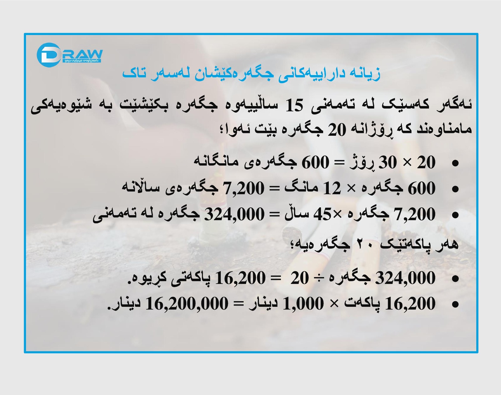 ? ئەگەر کەسێک لە تەمەنی (۱٥) ساڵییەوە تا تەمەنی (60) ساڵی بە بە شێوەیەکی مامناوەند کە ڕۆژانە تەنها (1) پاکەت جگەرە بکێشێت و هەر پاکەتێک بە تەنها (1000)دیناری پێبدات، ئەو لە (45) ساڵدا (16 ملیۆن و 200 هەزار) دیناری بۆ جگەرە خەرجکردووە.