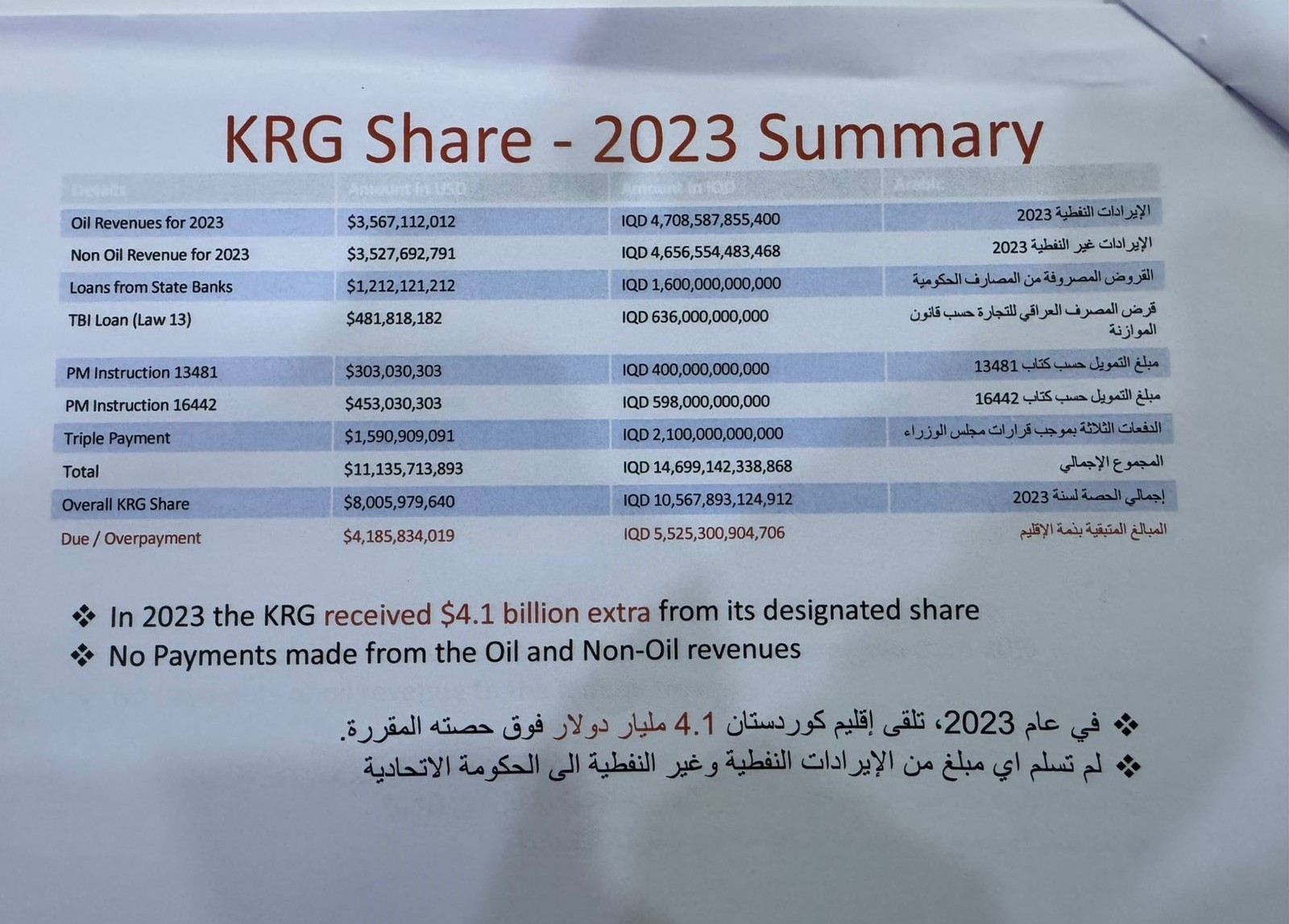 بە گوێرەی داتاکانی حکومەتی عێراق لە ساڵی 2023، هەرێمی كوردستان (4 ملیارو 100 ملیۆن) دۆلاری لە پشكی بڕیارلێدراوی خۆی زیاتر وەرگرتووە، لەبەرامبەردا هیچ داهاتێكی نەوتيی و نانەوتيی رادەستی خەزێنەی گشتی نەركردووە.