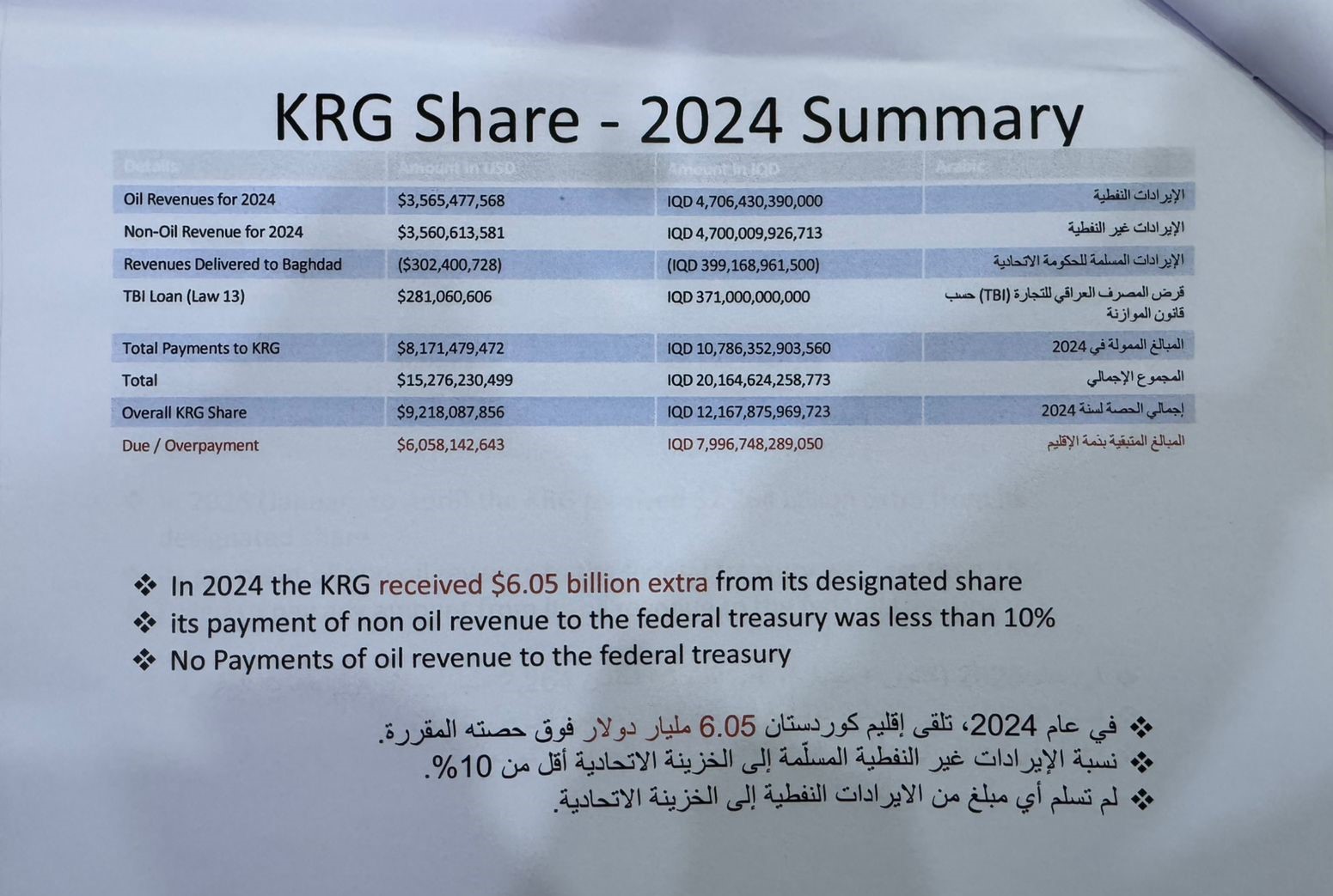 بە گوێرەی داتاکانی حکومەتی عێراق لە ساڵی 2024، هەرێمی كوردستان (6) ملیارو (50) ملیۆن دۆلاری لە سەرو پشكی خۆی وەرگرتووە، رێژەی داهاتە نەوتیە رادەستكراوەكان بە خەزێنەی گشتی كەمتر بووە لە (10%)، هیچ داهاتێكی نەوتی رادەستی خەزێنەی گشتی نەكردووە.