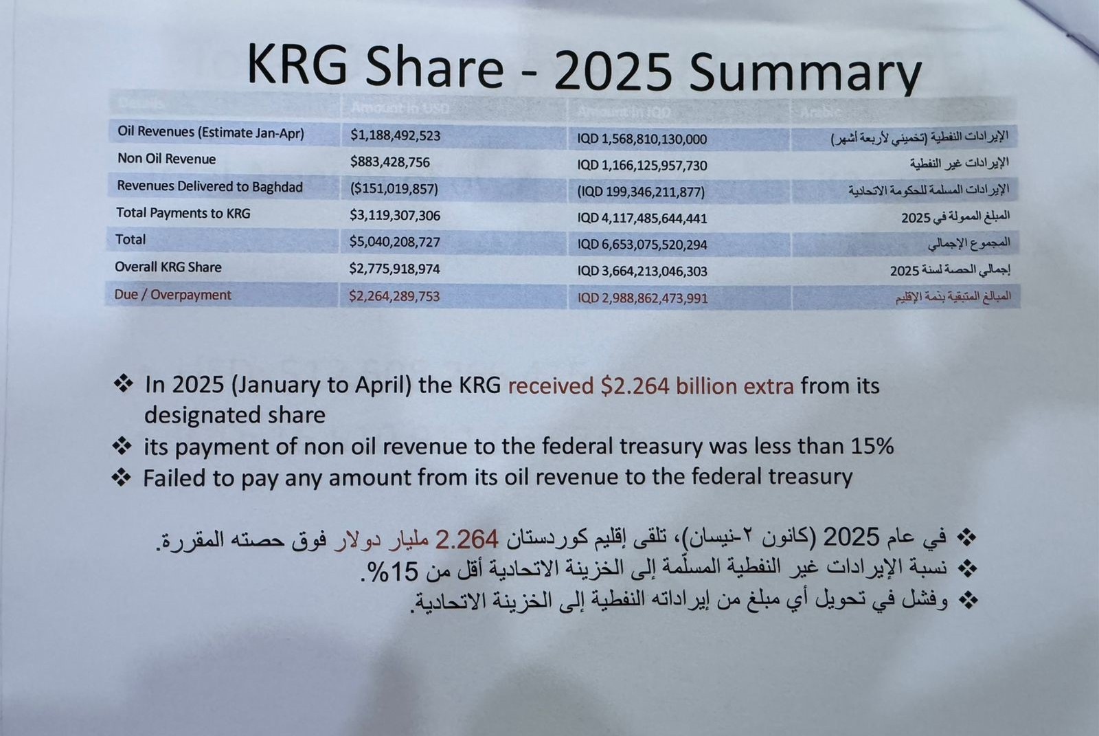 بە گۆێرەی داتاکانی حکومەتی عێراق لە ساڵی 2025 (كانوونی دووەم بۆ نیسان)، هەرێمی كوردستان لەسەرو پشكی بڕیارلێدراویيەوە، (2) ملیارو (264) ملیۆن دۆلارى بۆ رەوانەكراوە، رێژەی ئەو داهاتە نانەوتیانەی كە رادەستی خەزێنەی گشتی كردووە كەمتر لە (15%)یە، هەرێمی كوردستان هیچ بڕە پارەیەكی لە داهاتە نەوتیەكان رادەستی خەزێنەی گشتی نەكردووە.