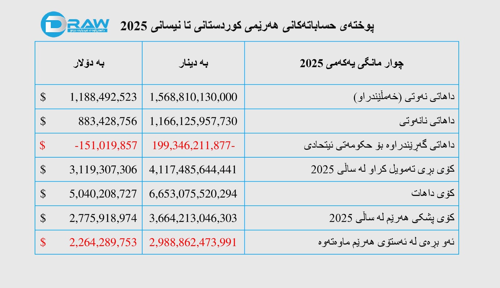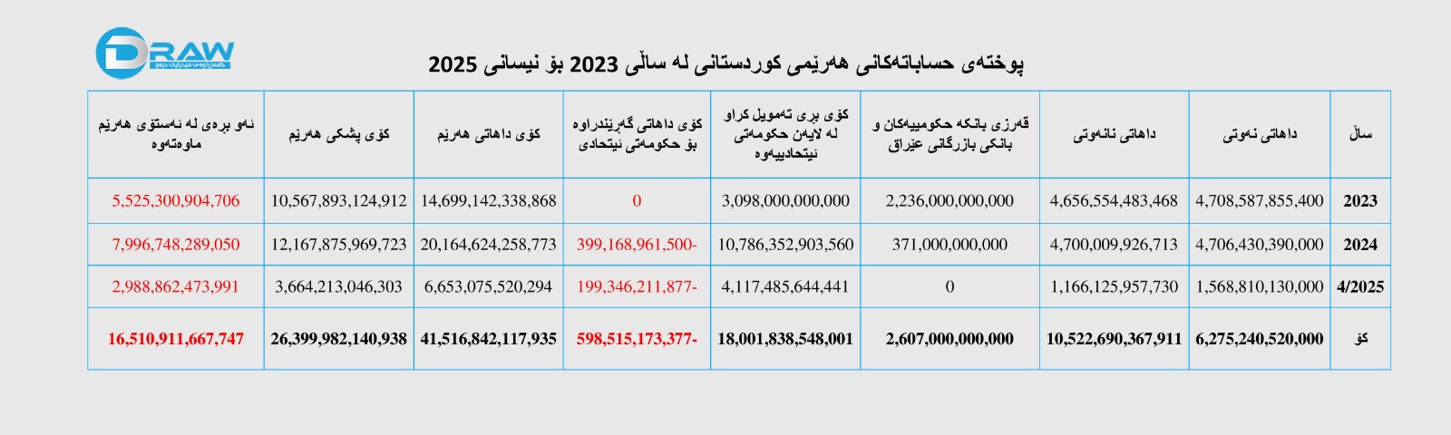(پوختەی حساباتەكانی هەرێمی كوردستانی لە 2023- نیسانی 2025) تیادا تۆماركراوە، کۆی ئەو داهاتەی هەرێم دەستی کەوتووە زۆرترە لە (41 ترلیۆن و 516 ملیار و 842 ملیۆن) دینار، لە کاتێکدا پشکی هەرێم بە پێی یاسای بودجە لە ماوەی ناوبراودا نزیکەی (26 ترلیۆن و 400 ملیار) دینار بووە، بەم پێیە لە ئێستادا نزیک لە (16 ترلیۆن و 511 ملیار) دینار لە ئەستۆی حکومەتی هەرێم ماوەتەوە، بە جۆرێک؛