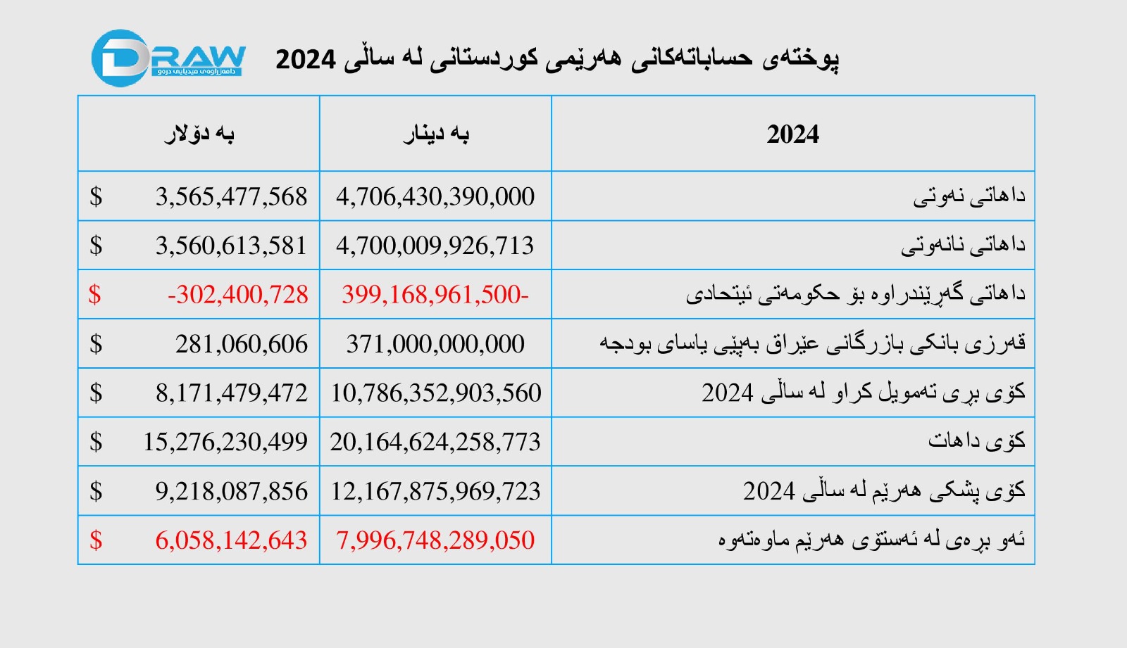 - بەم پێیە کۆی ئەو داهاتەی هەرێم دەستی کەوتووە زۆرترە لە (20 ترلیۆن و 164 ملیار و 624 ملیۆن) دینار، لە کاتێکدا پشکی هەرێم بە پێی یاسای بودجە لە ماوەی ناوبراودا نزیکی (12 ترلیۆن و 167 ملیار 876 ملیۆن) دینار بووە، بەم پێیە لەو ماوەیەدا نزیک لە (7 ترلیۆن و 997 ملیار) دینار لە ئەستۆی حکومەتی هەرێم ماوەتەوە، تەنها لە ساڵی 2024 دا.