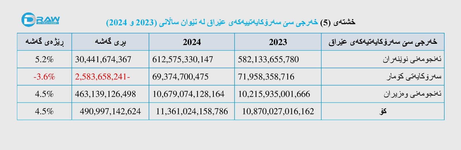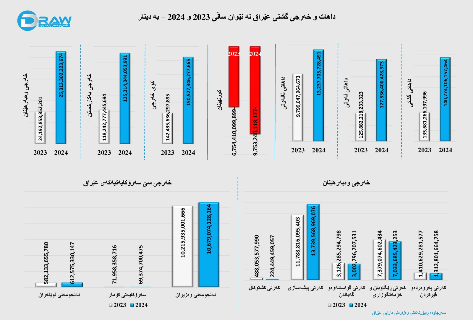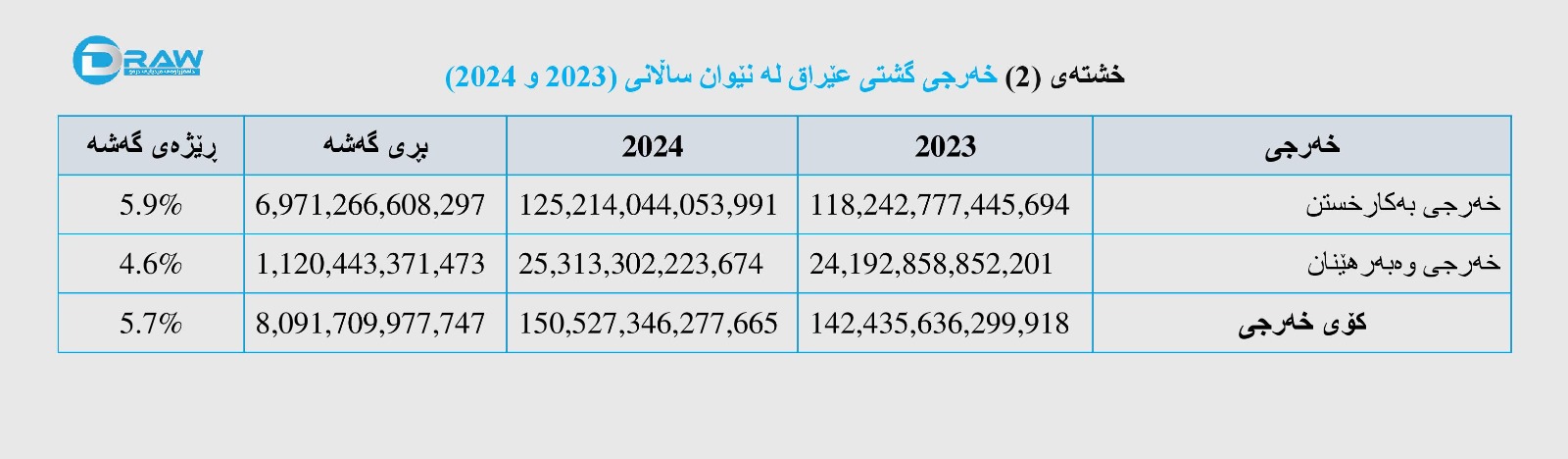 ? خەرجی گشتی عێراق لەساڵی (2023) لە (142 ترلیۆن و 435 ملیار) دینارەوە بەڕێژەی (5.7%) زیادی کردووەو لە ساڵی (2024) گەیشتووە بە سەرو (150 ترلیۆن و 527 ملیار) دینار.