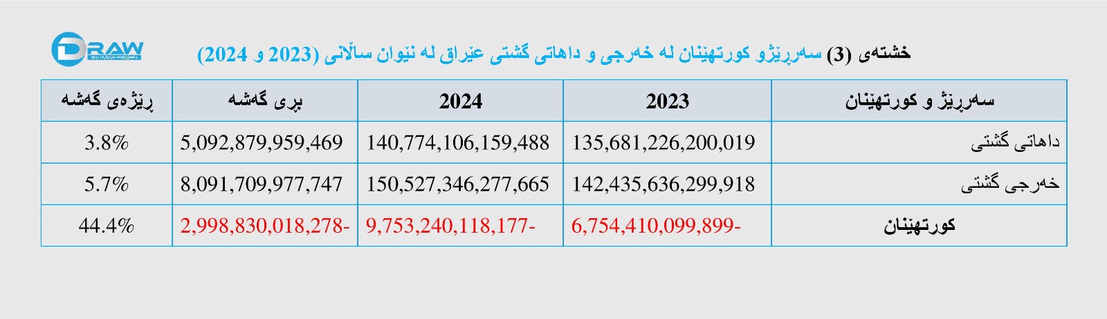 کەواتە بڕی کورتهێنان لە نێوان ساڵانی (2023 و 2024) بە بڕی (2 ترلیۆن و 998 ملیار و 830 ملیۆن و 18 هەزار) دینار و بە ڕێژەی (44.4%) زیادی کردووە.
