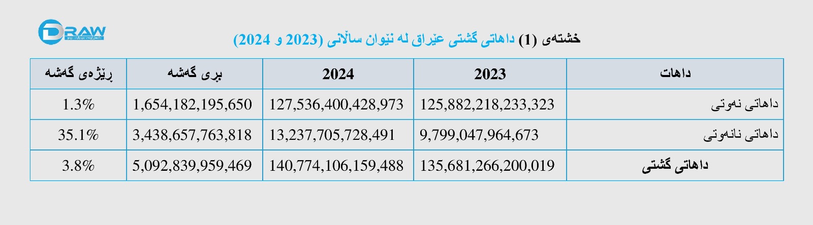 1.    داهاتی نەوتی لەساڵی (2023) لە (125 ترلیۆن و 882 ملیار و 218 ملیۆن و 233 هەزار) دینارەوە بەڕێژەی (1.3%) و بە بڕی (ترلیۆنێک و 654 ملیار و 182 ملیۆن و 195 هەزار) دینار گەشەی کردووەو لە ساڵی (2024) گەیشتووە بە (127 ترلیۆن و 536 ملیار 400 ملیۆن و 428 هەزار) دینار.