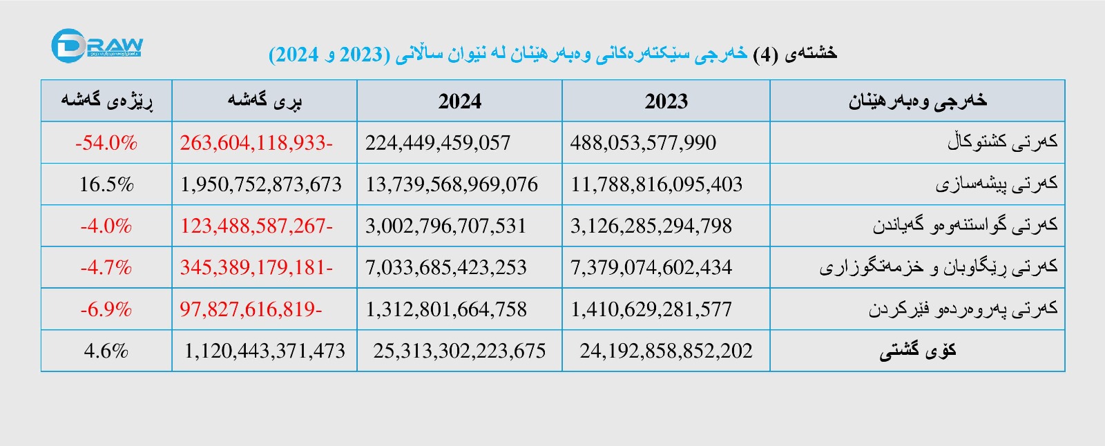 1.    کەرتی کشتوکاڵ؛ لە ساڵی (2023) بڕی (488 ملیار و 53 ملیۆن و 578 هەزار) دینار بۆ کەرتی کشتوکاڵ خەرجکرابوو، لە کاتێکدا لە ساڵی (2024) ئەو بڕە بە ڕێژەی (54%) دابەزیوە بۆ (224 ملیار و 449 ملیۆن و 459 هەزار) دینار.