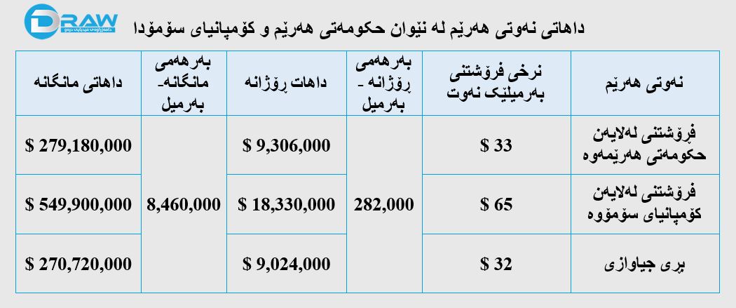 ئەو نەوتەی هەرێم دەیەوێت رادەستی عێراقی بكات (217) هەزار بەرمیلی رۆژانەیە، ئەگەر لەناوخۆی هەرێم بیفرۆشێت بەرمیلی بە (33) دۆلار، داهاتەكەی مانگانە دەكاتە (290) ملیار دینار، بەڵام ئەگەر لە رێگای سۆمۆوە بیفرۆشێت بەرمیلی بە (65) دۆلار ئەوا داهاتی مانگانەی دەكاتە (560) ملیار دینار.