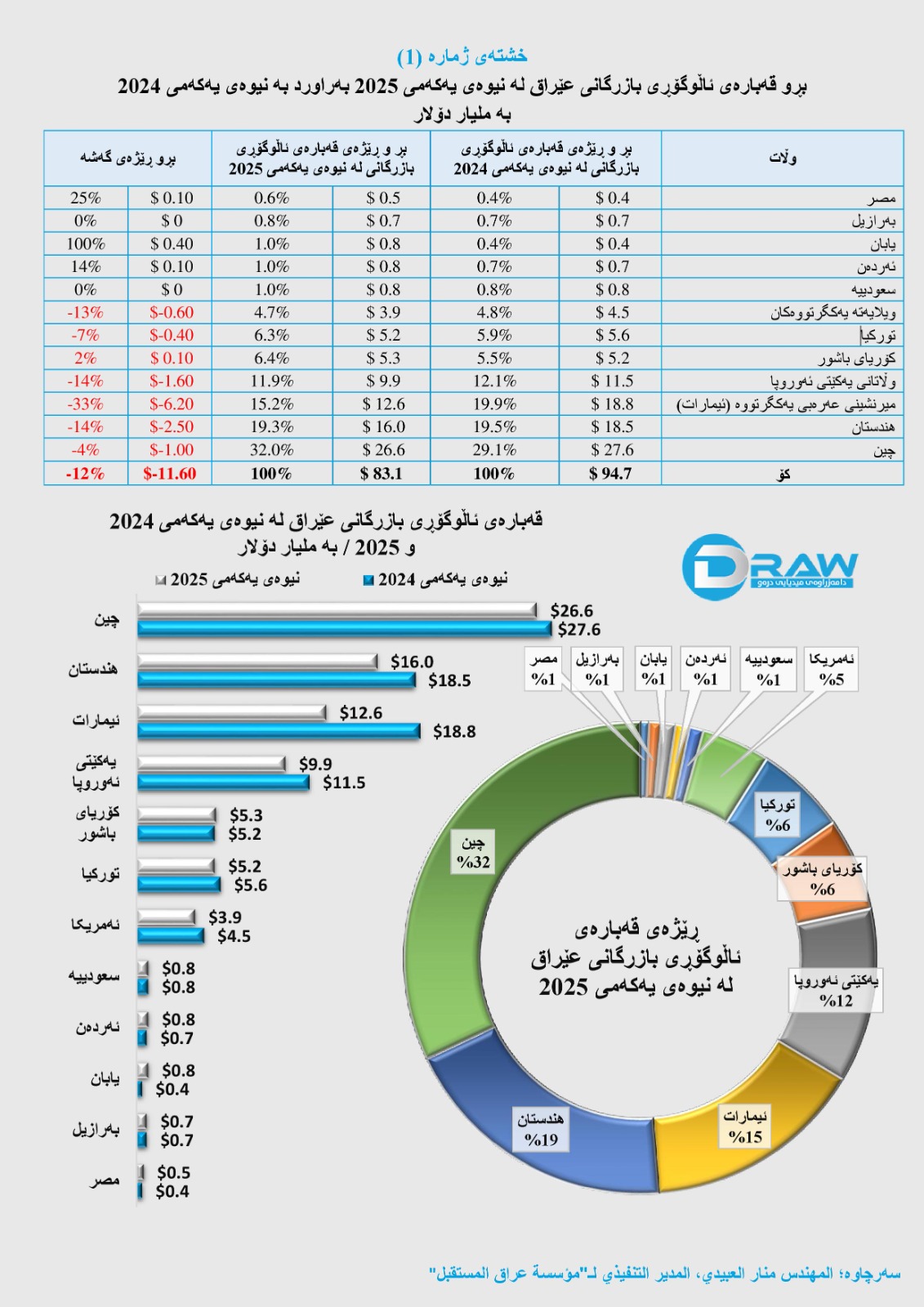 - ئاڵوگۆڕی بازرگانی لەگەڵ وڵاتی "شانشینی عەرەبی یەکگرتوو" لە نیوەی یەکەمی 2024 (18.8 ملیار) دۆلار و لە نیوەی یەکەمی 2025 (12.6 ملیار) دۆلار بووە.