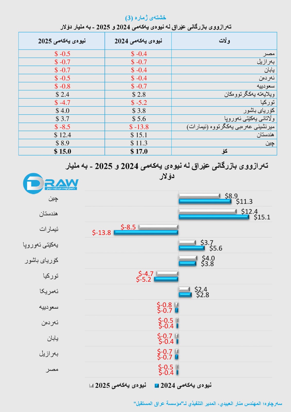 بۆ وەردەکاری زیاتر لەبارەی تەرازووی بازرگانی عێراق لەگەڵ وڵاتانی دیکە، بڕوانە خشتەو گرافیکی ژمارە (3).