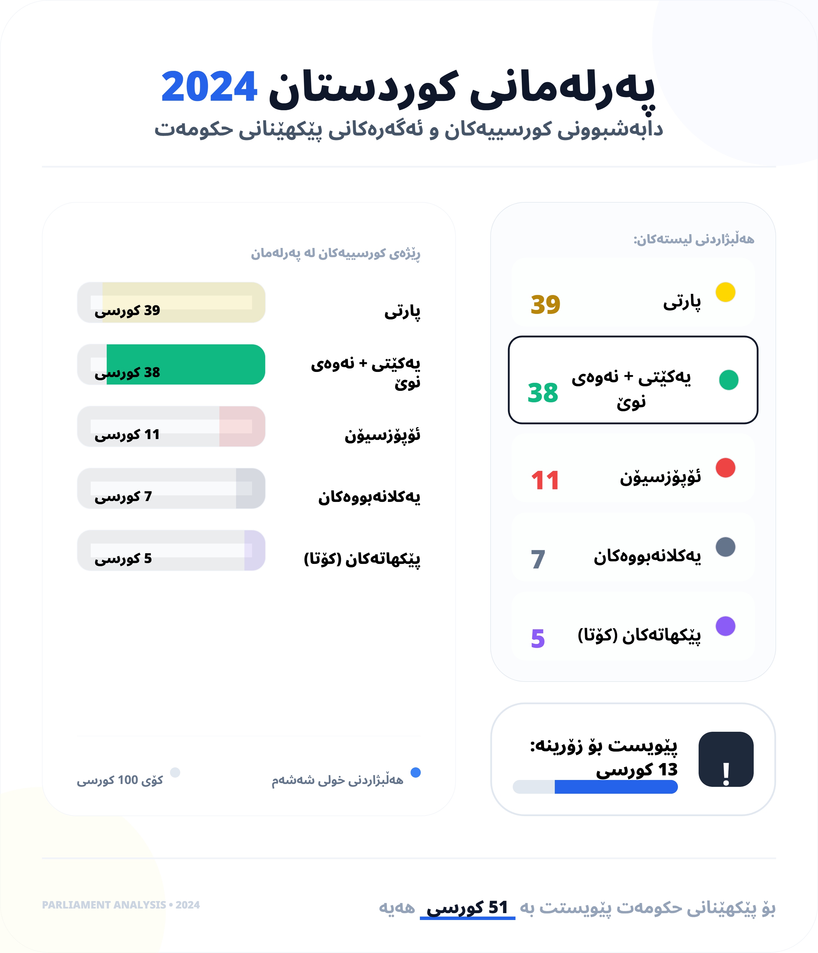 • پارتی: 39 کورسی (پێویستی بە 12 کورسی دیکە هەیە).