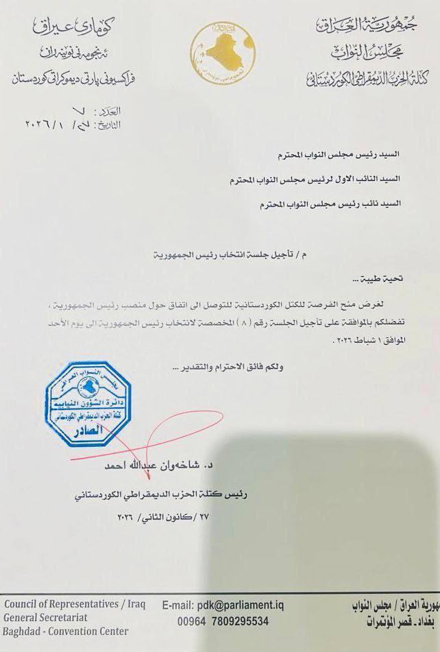 هەرچەند هێشتا پەرلەمان بەفەرمی وادەی نوێی بۆ سازدانی دانیشتنی پەرلەمان دیاری نەكردووە، بەڵام بەگوێرەی نوسراوێك كە (شاخەوان عەبدوڵا) سەرۆكی فراكسیۆنی پارتی لە پەرلەمان پێشكەشی كردووە، داوا كراوە دانیشتنەكە بۆ رۆژی یەكشەممەی ئایندە (1ی شوباتی 2026) دوابخرێت، ئەمە بۆ ئەوەی لایەنە كوردستانییەكان لەسەر كاندیدی پۆستەكە بگەنە رێككەوتن.