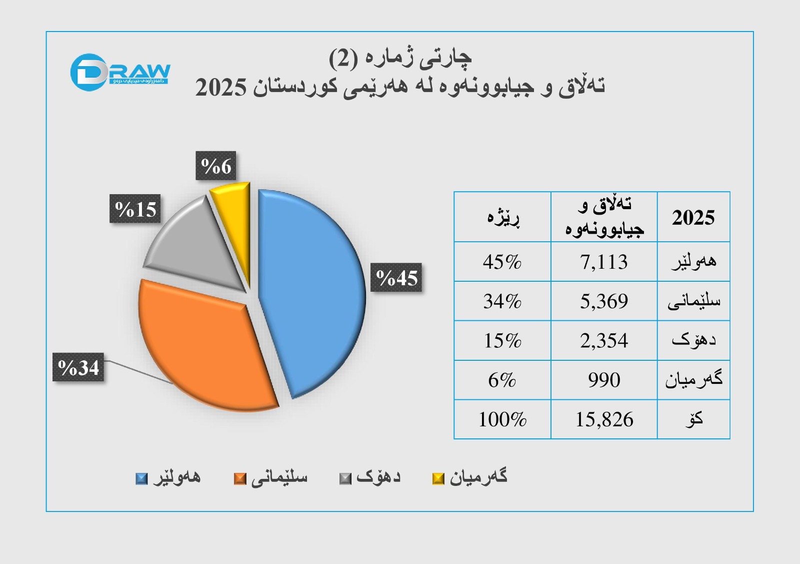 ? لەسەر ئاستی هەرێمی کوردستان (15 هەزار و 826) حاڵەتی جیابوونەوە تۆمارکراوە، بەرزترین رێژەی جیابوونەوە لە پارێزگای هەولێر بووە.