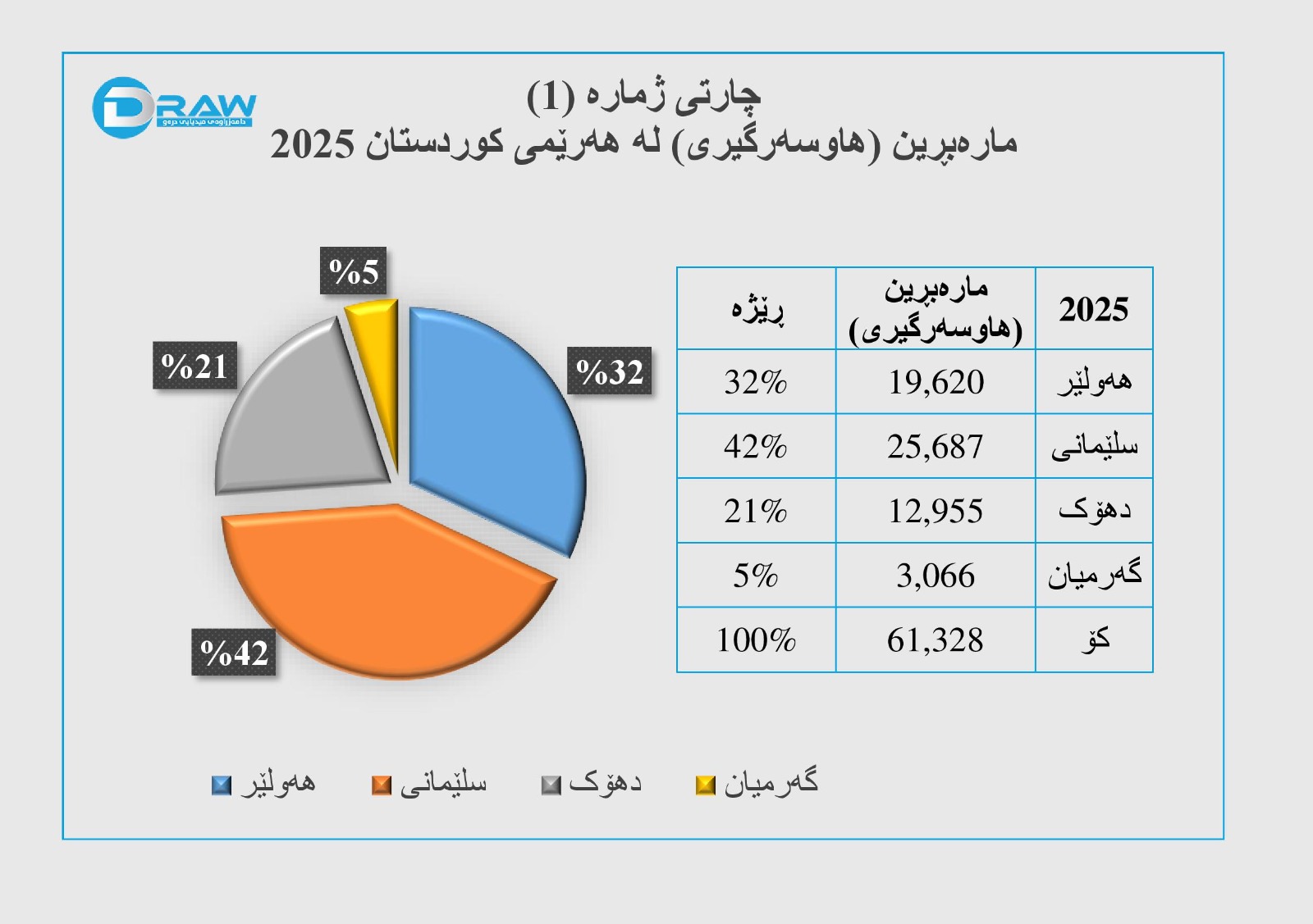 لەسەر ئاستی هەرێمی کوردستان (61 هەزار و 328) پرۆسەی هاوسەرگیری ئەنجامدراوەو زۆرترین رێژەی هاوسەرگیری لە پارێزگای سلێمانی بووە، وەک لە (چارتی ژمارە (1)) هاتووە، بە جۆرێک؛