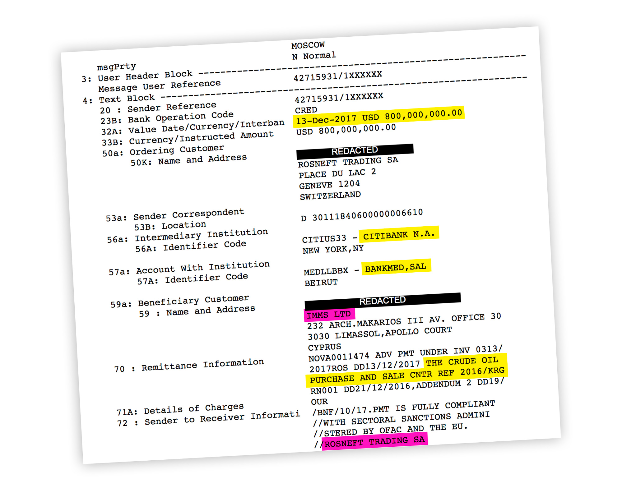 سایتەكە نوسیویەتی، مورتەزا لاخانی بە یەكجار (٨٠٠ ملیۆن) دۆلاری لەڕیگەی لقی بانكێكی روسی لە زیوریخ-ی سویسراوە بەڕێگەی ئەلكترۆنی حەواڵە كردووە بۆ بانكی Citigroup Incی نیورۆك، پێش گەیشتنی بە نیویۆرك، پارەكە یەكسەر حەواڵە كراوە بۆ بەیروتو چوتە سەر حسابی كۆمپانیای IMMSی مورتەزا لاخاكانی لە بانكی BankMedی لوبنانی.