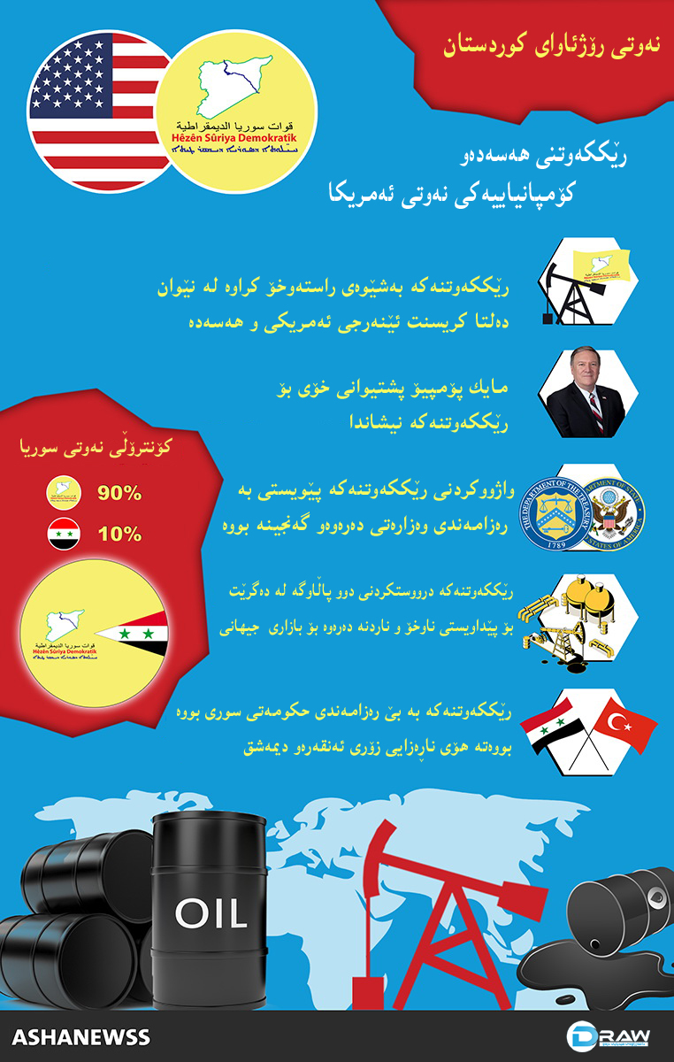 ئەوەی تائێستا باسدەكرێت لەبارەی رێككەوتنەكەی نێوان ئەمریكاو هێزەكانی سوریای دیموكرات، رێككەوتنەكە دروستكردنی دوو پاڵاوگەی نەوت لەخۆدەگرێت، یەكێكیان بۆ دابینكردنی سوتەمەنییە بۆ ناوچەكانی رۆژئاواو باكوری سوریا، ئەوی تر بۆ وەبازاڕخستنی نەوتە.