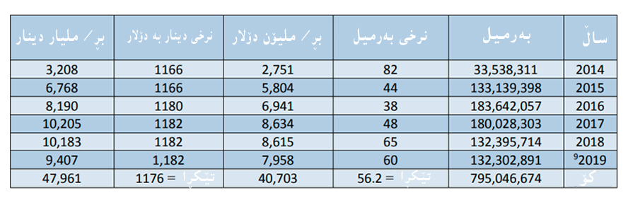 هەروەها لە ساڵی 2005ەوە بۆ 2019, هەرێم نزیكەی 100 ترلیۆن دیناری لە بەغداوە بۆ هاتووەو لە بەرامبەر ئەوەشدا هەرێم تەنها بڕی دوو ترلیۆن داهاتی بۆ حكومەتی ناوەندی گەڕاندوەتەوە.
