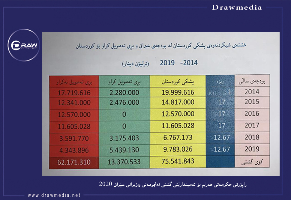• لە ساڵی 2014 بۆ 2019 پشكی هەرێم لە بودجەی گشتی عێراق (75 ترلیۆن و 514 ملیار و 843 ملیۆن) دینار بووە، بەڵام لەو بڕە تەنیا (13 ترلیۆن و 370 ملیارو 533 ملیۆن) دیناری بۆ هاتووەو ( 62 ترلیۆن و 171 ملیارو 310 ملیۆن) دیناری لێبڕدراوە بەهۆی ئەوەی نەوتەكەی رادەستی بەغداد نەكردووە.