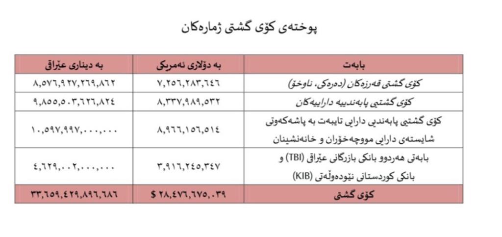 لەم خشتەیەی خوارەوەدا پوختەی قەرازەکانی سەر حکومەتی هەرێم ڕونکراوەتەوە پێش خەرجکردنی موچەی مانگەکانی (5، 6، 7، 8، 11،12ی ساڵی 2020)ی فەرمانبەرانی هەرێمی کوردستان؛