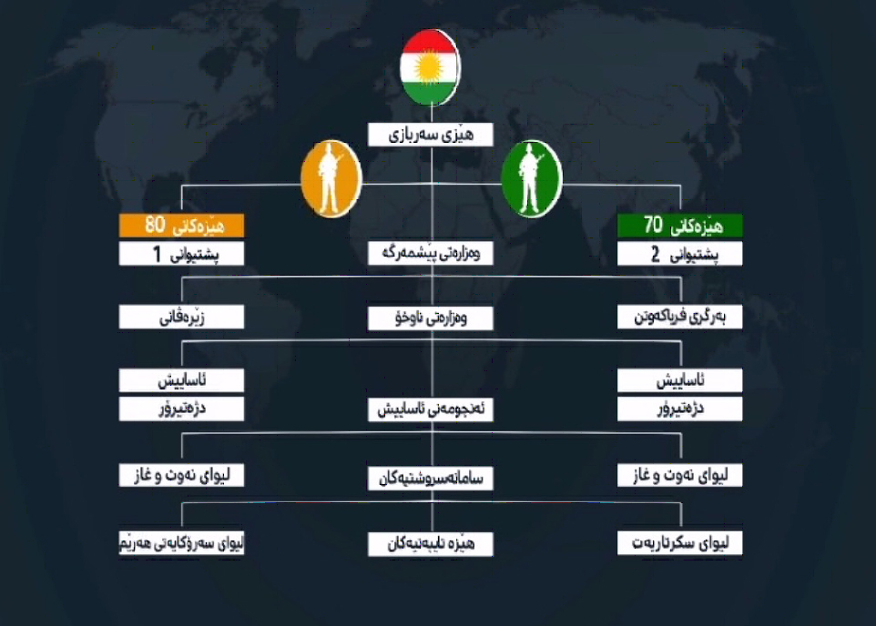 هەر بە تێڕوانینێک لەو نەخشەیە، ئەو ڕاستییە ڕوندەبێتەوە کە هێزە چەکدارەکانی هەرێمی کوردستان، چۆن دابەشبون بەسەر دوهێزی دەسەڵاتداری هەرێمی کوردستان، سەرجەمیان لە بودجەی گشتی هەرێمی کوردستان سودمەندن، بەڵام ئەرک و کاری بەشێکی زۆریان لە خزمەتی ئەو دو هێزەدان و فەرمان لەوان و لە بەرپرسانی حیزب وەردەگرن، بەشێکیش لەنێو ئەواندا پارێزگاری لە ئەشخاس و کەسایەتییەکانی ناو حیزب دەکەن، لەنێو ئەو هێزانەشدا بەخشینەوەى پۆست و پلەی سەربازی بەزر دیاردەیەکی ئاشکراو ڕونە.