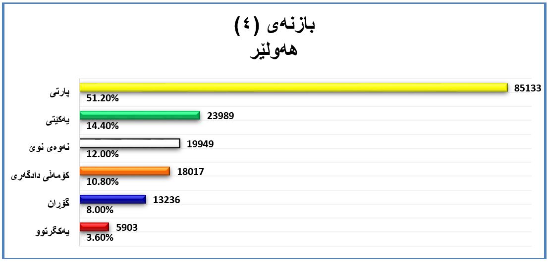 بازنەی (4): کە ناسێنراوە بە بازنەی (بەشی خۆرهەڵاتی قەزای هەولێر)، دەنگی لایەنە سەرەکییەکانی پارێزگای هەولێر لەسەر بنەمای هەڵبژاردنی ٣٠ی ٩ی٢٠١٨بەم شێوەیەن (بڕوانە چارتی ژمارە (٤))