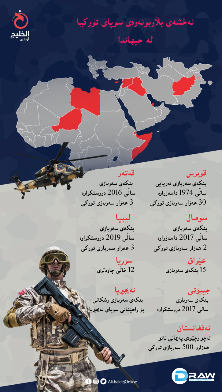 جگە لە عێراق و هەرێمی کوردستان تورکیا لە چەندین وڵاتی دنیا بنکەو بارەگای سەربازی هەیە؛ ئەوانیش؛