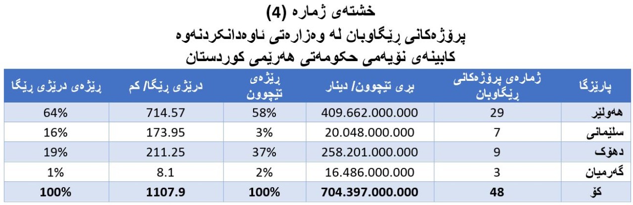 بەپێی ڕاپۆرتەکەی ئەنجومەنی وەزیران، لە سەردەمی کابینەی نۆیەمی حکومەتی هەرێمی کوردستان (48) پرۆژەی ڕێگاو بان تەواوکراون بە گوژمەی (407 ملیارو 397 ملیۆن دینار)، بەشی هەرە زۆری پرۆژەکان دەکەوێتە سنوری پارێزگای هەولێرەو بەدوای ئەویشدا پارێزگای دهۆک و پاشان پارێزگای سلێمانی دێت (بڕوانە خشتەی ژمارە(4)).
