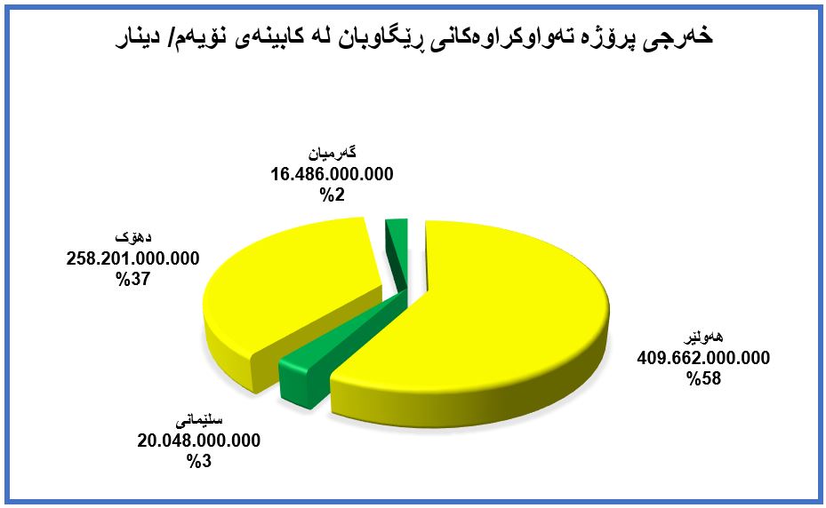 لە کابینەی نۆیەمی حکومەتی هەرێمی کوردستان بە گوژمەی زیاتر لە (700) ملیار دینار (48) پرۆژەی ڕێگاوبان تەواو کراوە، كە (667 ملیار) دینار بەرێژەی (95%) لە هەولێر و دهۆك و (5%)ی لە سلێمانی گەرمیان خەرجكراوە، كە (38) پرۆژەی لە هەولێرو دهۆك و (10) پرۆژەی لە سلێمانی گەرمیان جێبەجیچكرداوە.