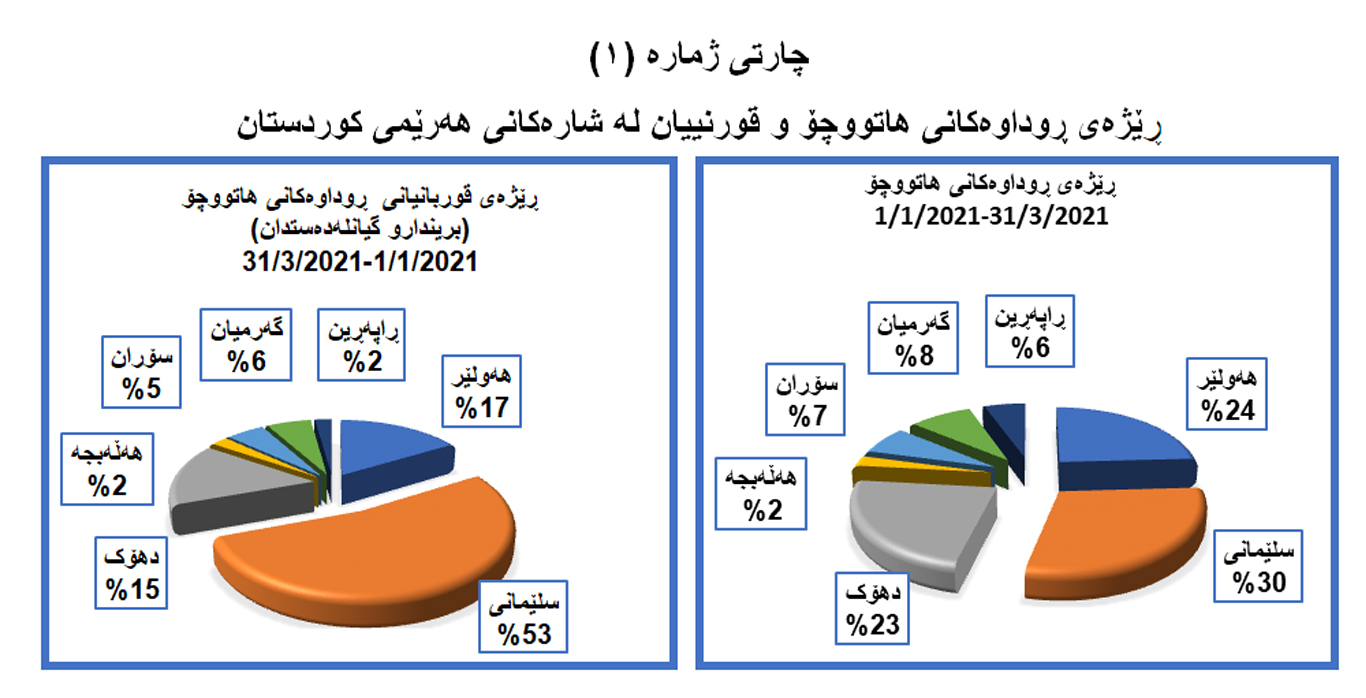 ئەمە لەكاتێكدایە زۆرینەی قوربانیانی رووداوەكانی هاتوچۆ لەپارێزگای سلێمانی بووە بەرێژەی (63%) و قوربانیانی روداوەكانی هاتوچۆ لە هەولێر و دهۆك (37%) بووە، لە سێ مانگی یەکەمی ساڵی 2021 لە سلێمانی (251) ڕوداوی هاتووچۆ هەبووەو (819) قوربانی لێكەوتووەتەوە، بەڵام لە پارێزگای هەولێر (205) ڕوداوی هاتووچۆو هەبووە (252) قوربانی لێكەوتووەتەوە لە پارێزگای دهۆک (196) ڕوداوی هاتووچۆو (233) قوربانی لێكەوتووەتەوە، كە هۆكاری سەرەكی رووداوەكانی هاتوچۆ خراپی رێگاوبانەكانە.