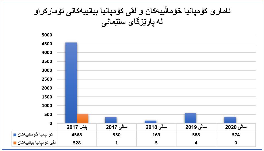 بوژانەوەیەک بەدی دەکرێت، بەراورد بە دوو ساڵی پێش خۆی و کۆی ژمارەی کۆمپانیای تۆمارکراو لە پارێزگای سلێمانی (592) کۆمپانیا بووە، بە جۆرێک (%99)ی کۆمپانیای خۆماڵی بوونەو ژمارەیان (588) کۆمپانیا بووە. هاوکات بە ڕێژەی (%1) و (4) لقی کۆمپانیا بیانییەکان بووە.