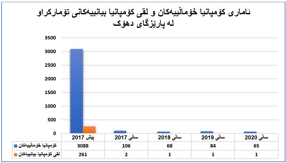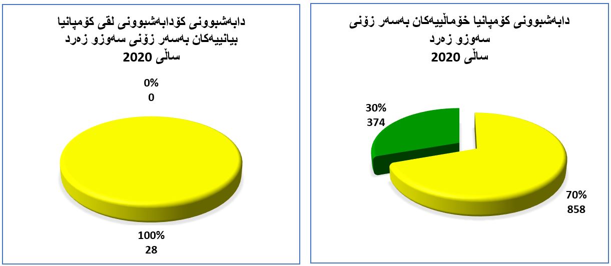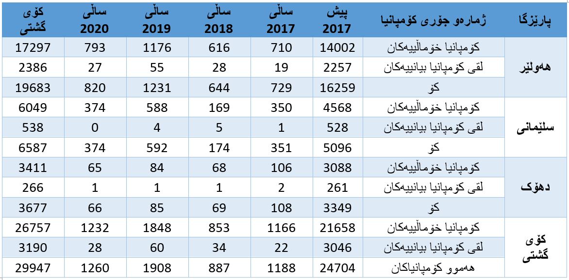 بەڵام لە ساڵی (2020) (هەزار و 260) کۆمپانیا تۆمار کراوە، بە جۆرێک (%98)ی کۆمپانیای خۆماڵی بوونەو ژمارەیان (هەزارو 232) کۆمپانیا بووە. هاوکات بە ڕێژەی (%2) و (28) لقی کۆمپانیا بیانییەکان بووە لە هەرێمی کوردستان.