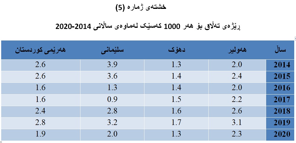 2. ڕێژەی تەڵاق: ڕێژەی تەڵاق بۆ هەر (1000) کەسێک لە دانیشتوان هەژمار کراوە بەپێی ژمارەی ئەنجامدراوی تەلاق لەسەر کۆی ژمارەی دانیشتوان بۆ تەمەنی (15) ساڵ و زیاتر لە هەمان ساڵ (بڕوانە خشەی ژمارە (5)).