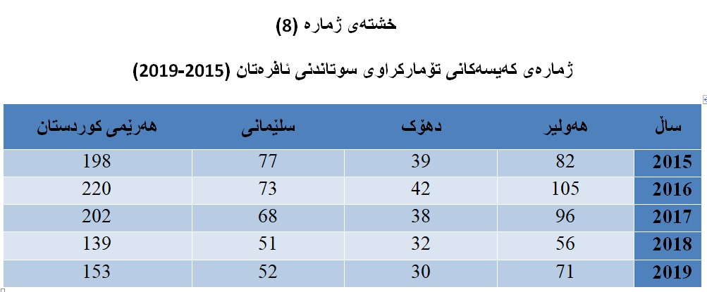 بریتیە لە ژمارەی ئەو کەیسانەی کە تۆمار کراون تایبەت بە سوتاندنی ئافرەتان، (بڕوانە خشتەی ژمارە (8)) کە ئامارەکانی خۆکوشتنی ئافرەتان خراوەتەڕوو لە ماوەی ساڵانی (2015-2019).