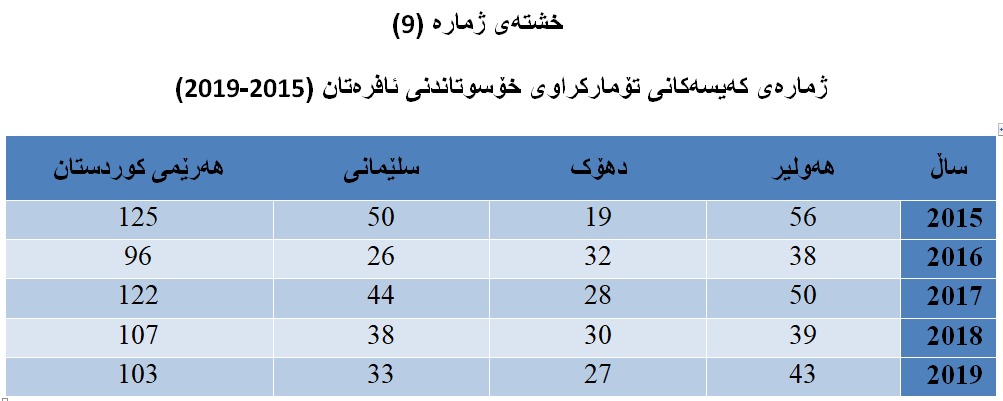 بریتیە لە ژمارەی ئەو کەیسانەی کە تۆمار کراون تایبەت بە خۆسوتاندنی ئافرەتان، (بڕوانە خشتەی ژمارە (9)) کە ئامارەکانی خۆکوشتنی ئافرەتان خراوەتەڕوو لە ماوەی ساڵانی (2015-2019).
