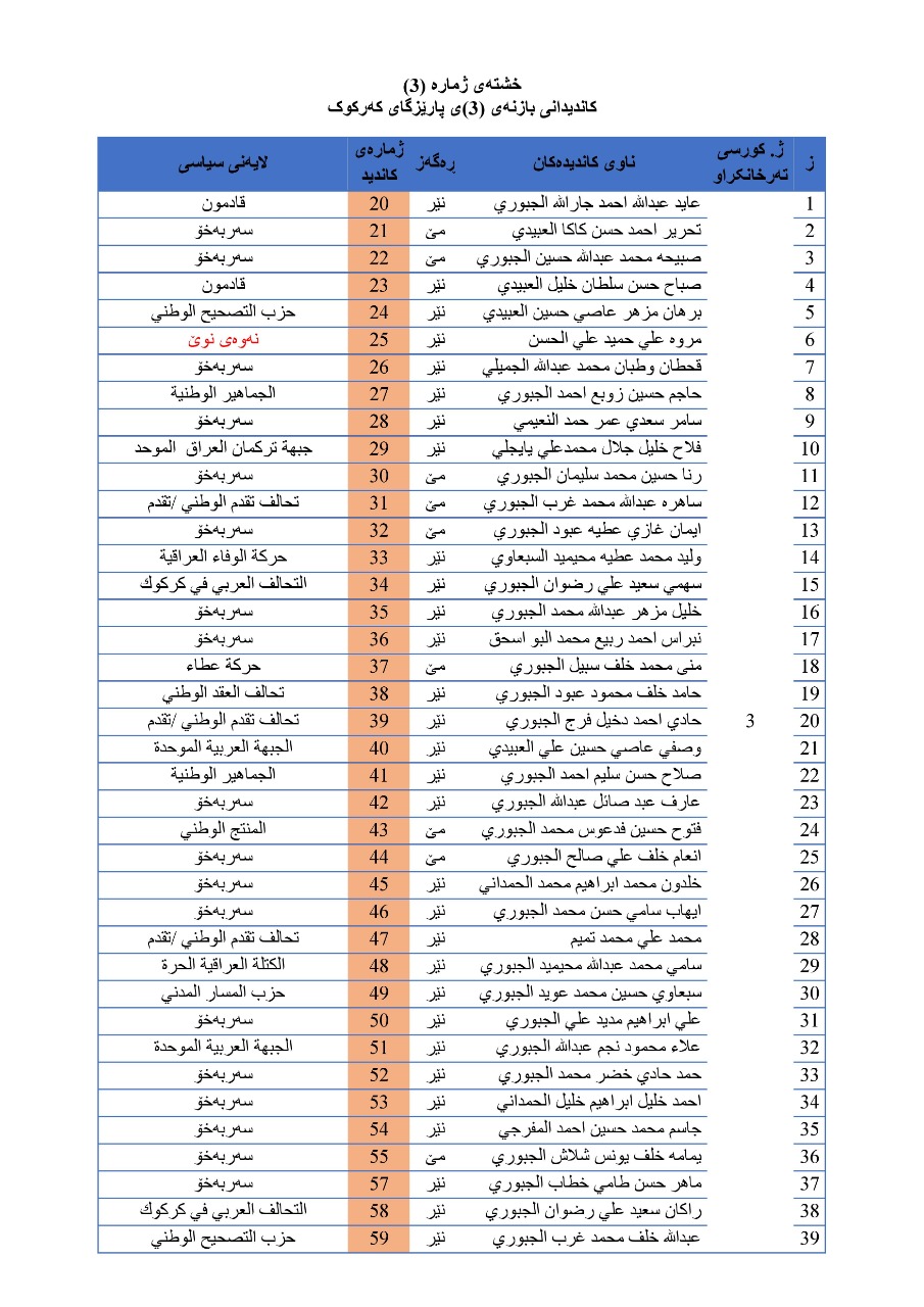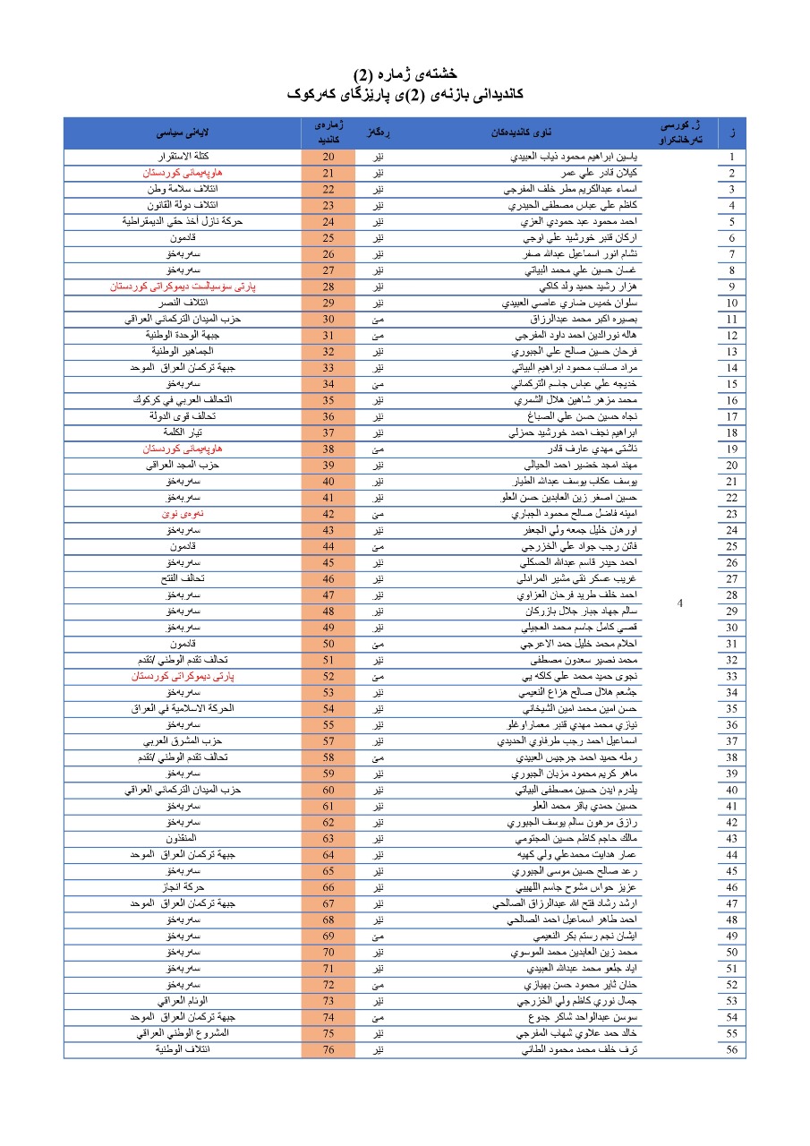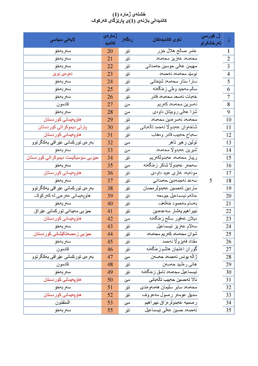 - نەوەی نوێ لە بازنەی (1)ی کەرکوک (1) کاندیدو لە بازنەی (2)ی کەرکوک (1) کاندیدو لە بازنەی (1)ی کەرکوک کاندیدی هەیە.