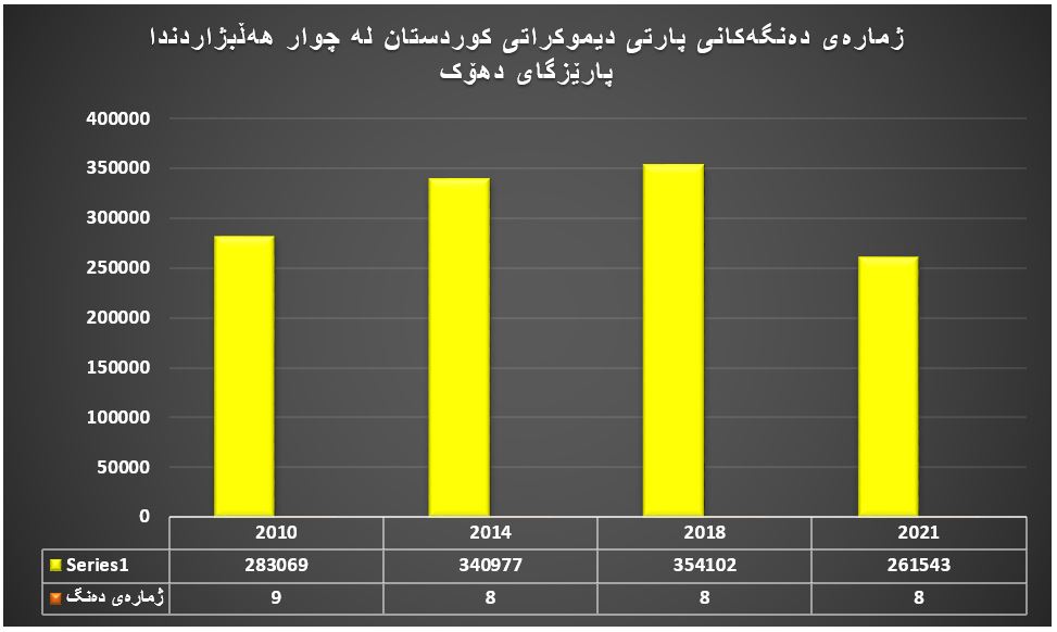 بەڵام پارتی دیموکراتی کوردستان بەردەوام دەنگی کەمی کردووە، لە هەڵبژاردنی ساڵی 2010 لەسەر ئاستی هەرسێ پارێزگاکەی هەرێم (671 هەزار و 965) دەنگ، لە هەڵبژاردنی 2014 دا (730هەزارو 14) دەنگ و لە هەڵبژاردنی 2018دا (724 هەزارو 727) دەنگ و بە پێی دوایین ئەنجامی هەڵبژاردنی 2021 لەسەر ئاستی هەرسێ پارێزگاکەی هەرێم (579 هەزار و 243) دەنگی بەدەستهێناوە واتە بەراورد بە هەڵبژاردنی 2018 پارتی لە سێ پارێزگاكەی هەرێم (145 هەزارو 484) دەنگ كەمیكردووە..