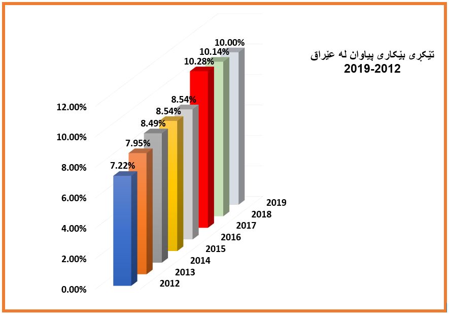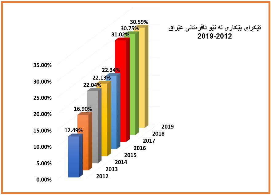 لەگەڵ گەشەی دانیشتوان لە عێراقدا ڕێژەی بێکاری لە پەرەسەندندایە، چونکە گەشەی دانیشتوان فشارێکی گەورەیە لەسەر بازاڕی کار و نەیتوانیوە لە ئاستی پێداویستی گەشەسەندنی هێزی کاردابێت، لەگەڵ زیادبوو ژمارەی ساڵەکان تێکڕای بێکاریش زیادی کردووە، بۆ نمونە لە ساڵی (2012) بێکاری لە نێو ڕەگەزی نێردا (7.22%) بووە، بەڵام بەشێوەیەکی تەدریجی ڕێژەکە لە سالێ (2017) گەیشتووە بە (10.28%)، هەربۆیە زیادبوونی ڕێژەی بێکاری و کۆنترۆڵ نەکردنی هەڵئاوسانی دانیشتوان، هاوکاتە لەگەڵ بەرزبوونەوەی ڕێژەی هەژاری، ئەمانەش ئاڵنگاری گەورە دەبن لەبەردەم کۆمەڵگاو حکومەت کە ساڵانی داهاتوودا. (بڕوانە خشتەی ژمارە (5)) کە ڕێژەی بێکاری لەنێو ڕەگەزی نێردا پیشان دەدات لە ماوەی ساڵانی (2012-2019).